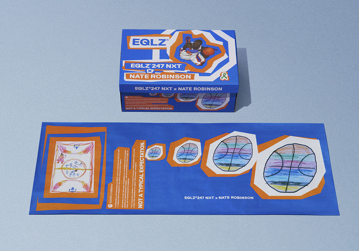 The storytelling extends to the packaging as well. The shoebox features basketball-themed illustrations created by children undergoing dialysis at Seattle Children’s Hospital. Robinson’s own battle with kidney failure and eventual transplant was a central theme of his first EQLZ release and remains a meaningful part of his post-playing career narrative.