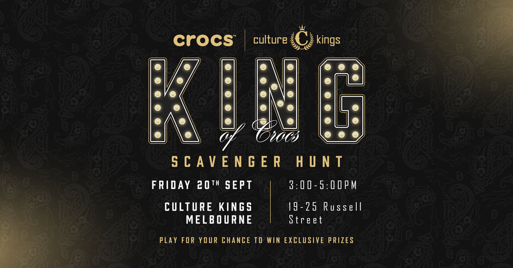 Culture Kings is set to take over Melbourne CBD on Friday, 20th of September 2024 in celebration of two iconic brands, Culture Kings and Crocs, coming together to create an epic collaboration footwear that we're dubbing "King of the Crocs". We're making you part to the celebrations, giving Melbourne customers the chance to join in on an epic Scavenger Hunt for their chance to win the major prize: A Year of Culture Kings & A Year of Crocs. WHEN IS IT? Friday, 20th September 2024 from 3PM. WHERE DO I START? Your starting point is Culture Kings Melbourne (19-25 Russell St, Melbourne). Meet our team there to receive your first clue and then get ready to run around Melbourne to get your chance at claiming this major prize. HOW DO I WIN? 1. Collect your first clue from Culture Kings Melbourne and decipher the code to find your favourite content creator, Johnny Tuivasa, at Secret Location 1. Meet up with Johnny to collect your Jibbet and your next clue.2. Your second clue will lead you to the one and only, AFL Star Tom Baulch, where you will collect yet another token Jibbet and the clue to the Final Secret Destination. 3. Once you get to the Final Location, present your tokens for the chance to roll the Crocs x Culture Kings "King of the Crocs" Mega Dice - first person to land on the Duke takes home the mega prize.Good luck! Melbourne, don't miss out! Friday, 20th September at 3PM - join this epic Scavenger Hunt around Melbourne to win the epic major prize!