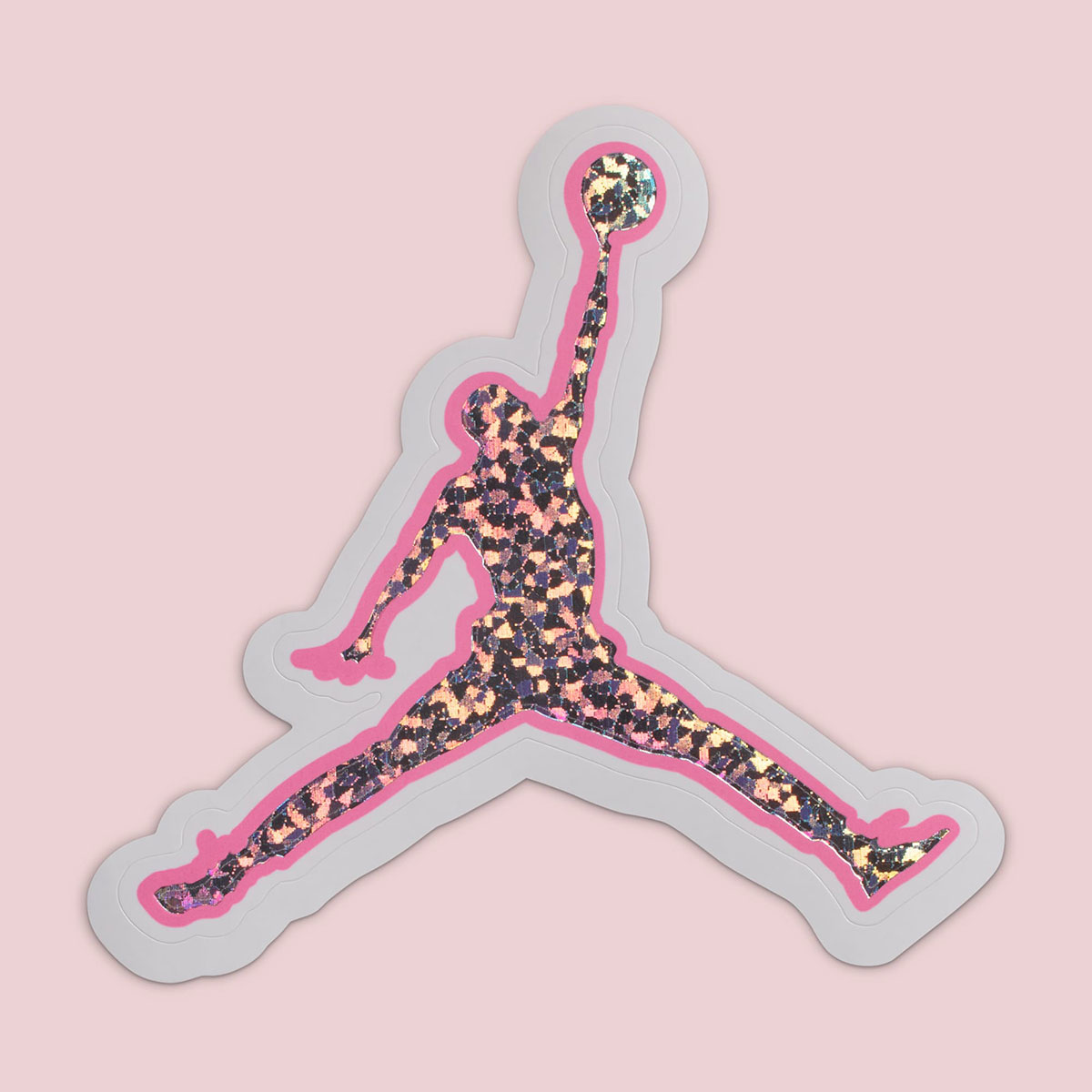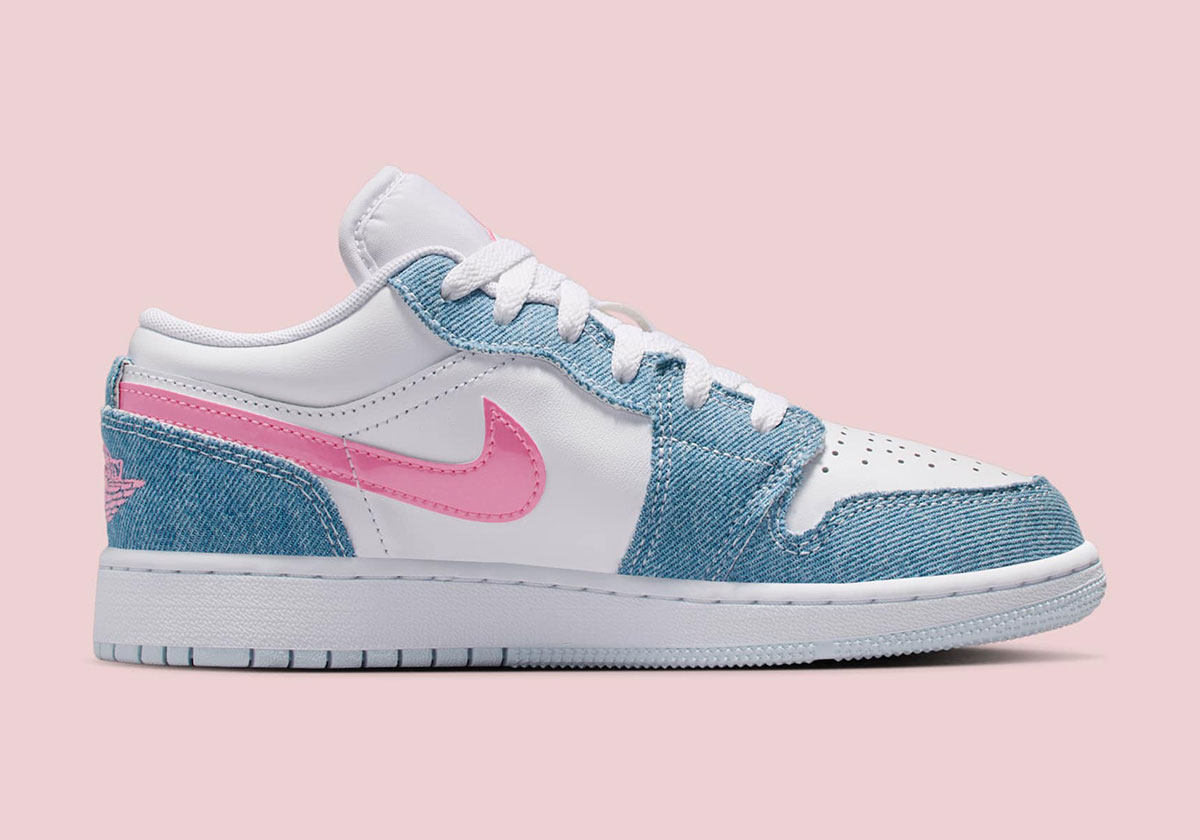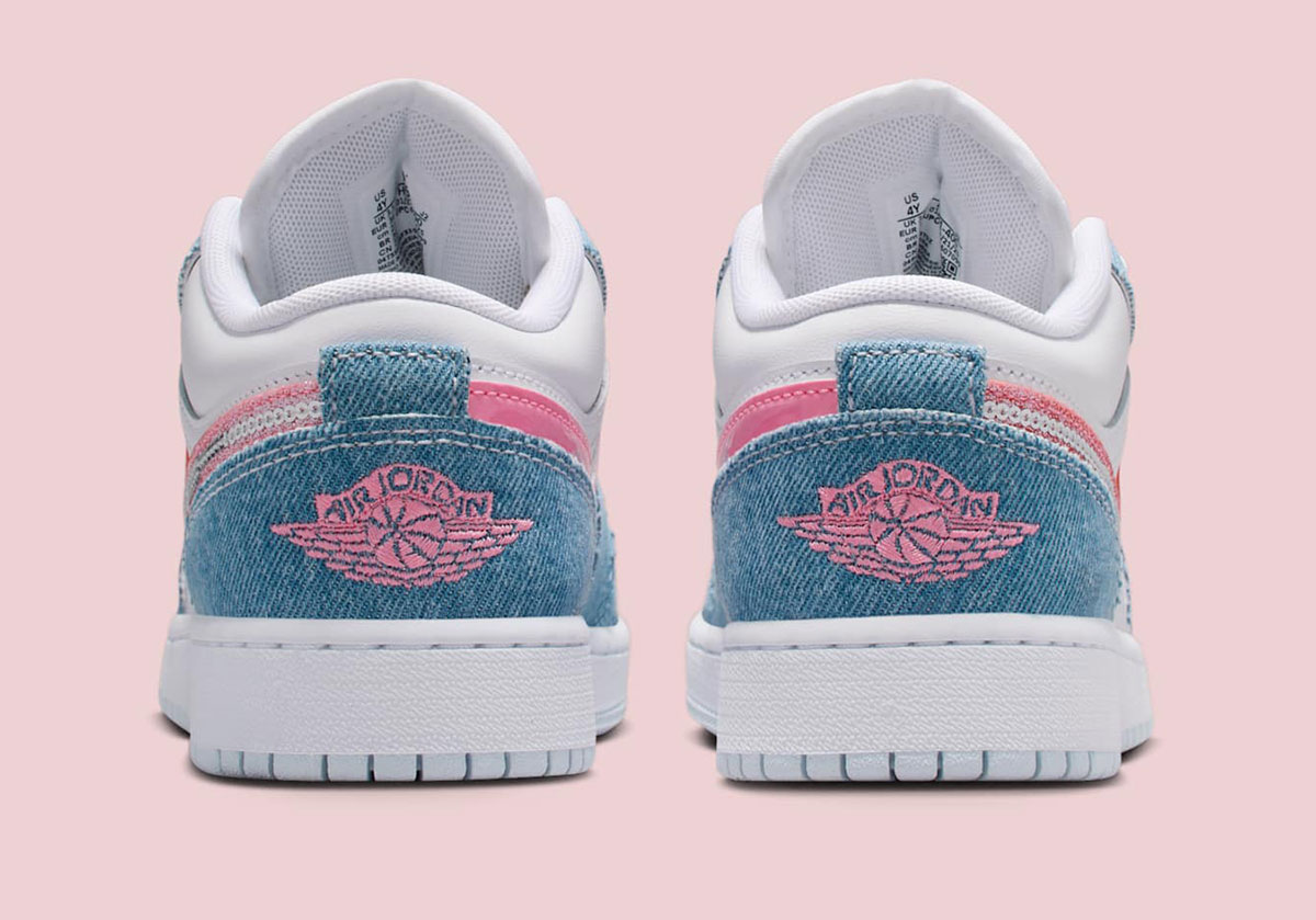 Official images reveal light wash denim over the toe, eyelets, and heel, complemented by white leather across the base. The lateral Swoosh takes on a glittery finish featuring silver sequin outlining, while the opposite side features a pink patent leather Swoosh. Matching pink hits appears on the tongue Jumpman and heel Wings logos, while a white midsole and light blue outsole round out the delivery underfoot. As an extra add-on, these come with a shimmery Jumpman sticker that matches the sequin detailing.