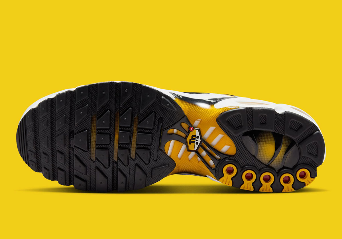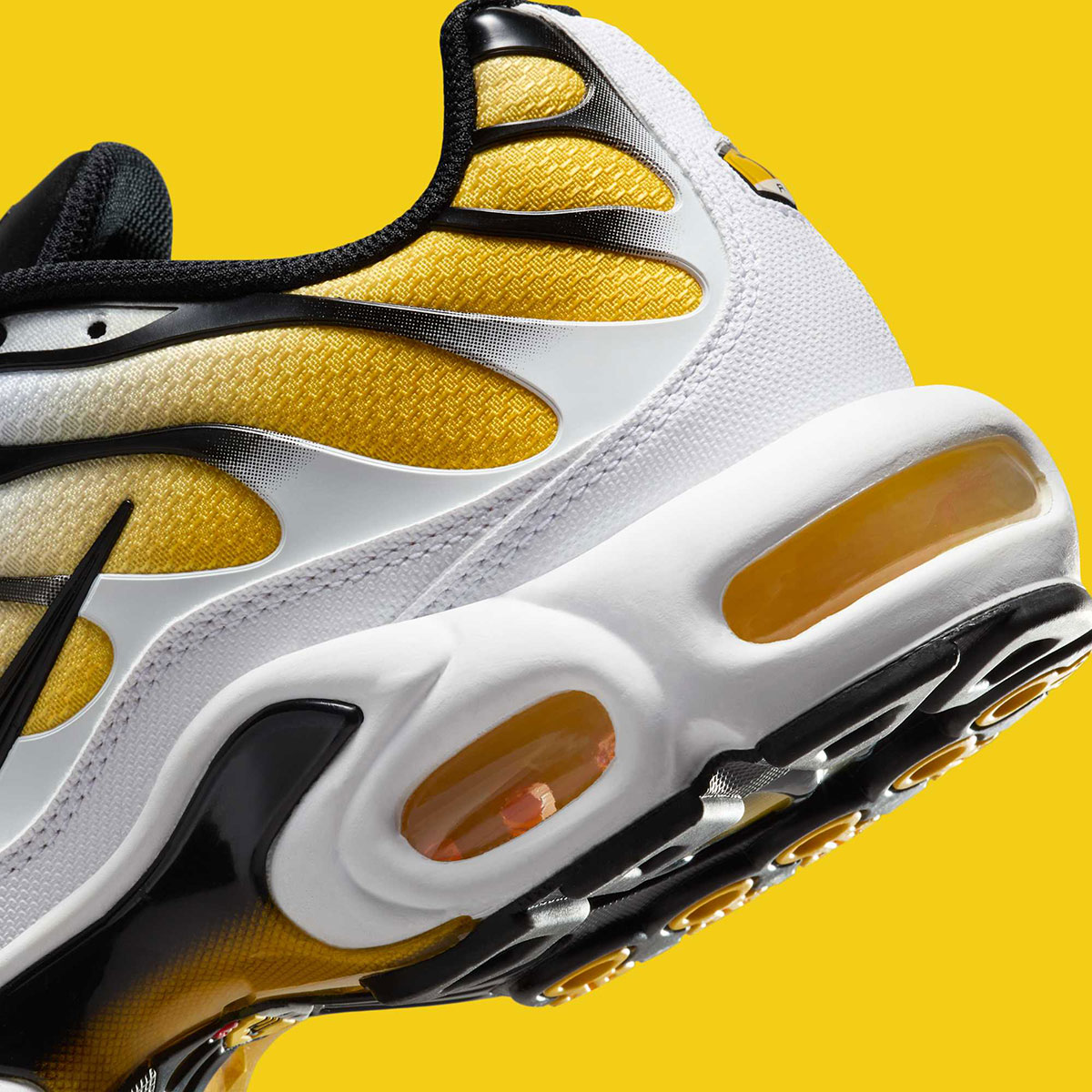 As with myriad TN colorways, the design is anchored by a gradient base. The rear comes in bright yellow to match the Air bubbles and TN branding, gradually fading into white as you approach the quarter. The wave-inspired overlays transition from black to white from the top-down, overlaid by all-black Swoosh logos for contrast. The tongue, laces, and lining all come in black, while a white midsole and black/yellow outsole complete the delivery underfoot.