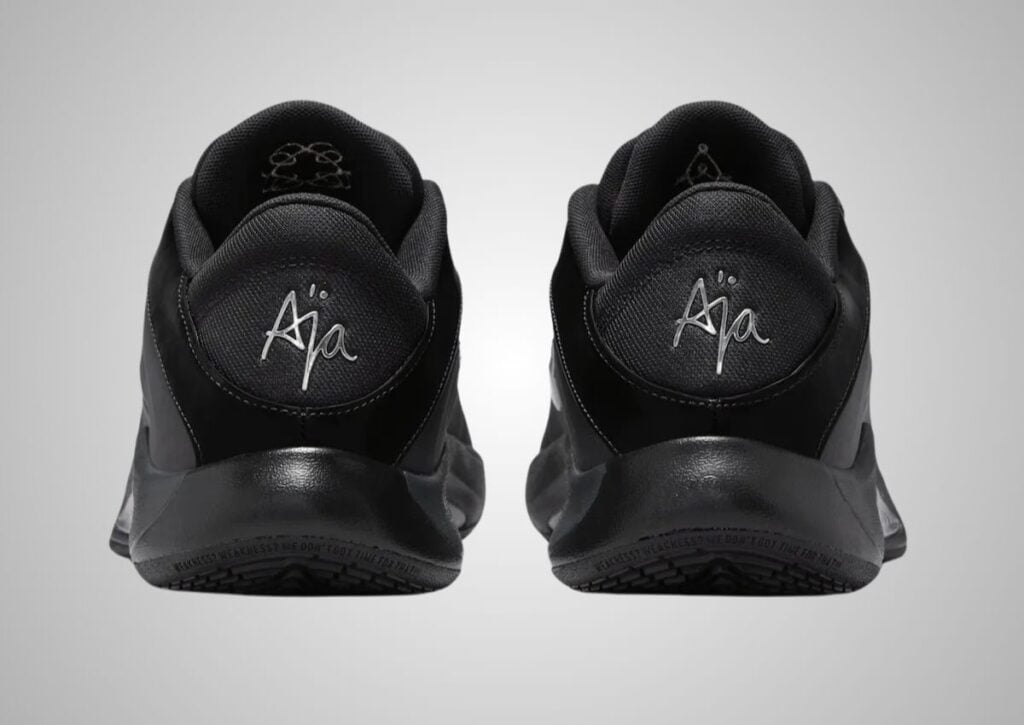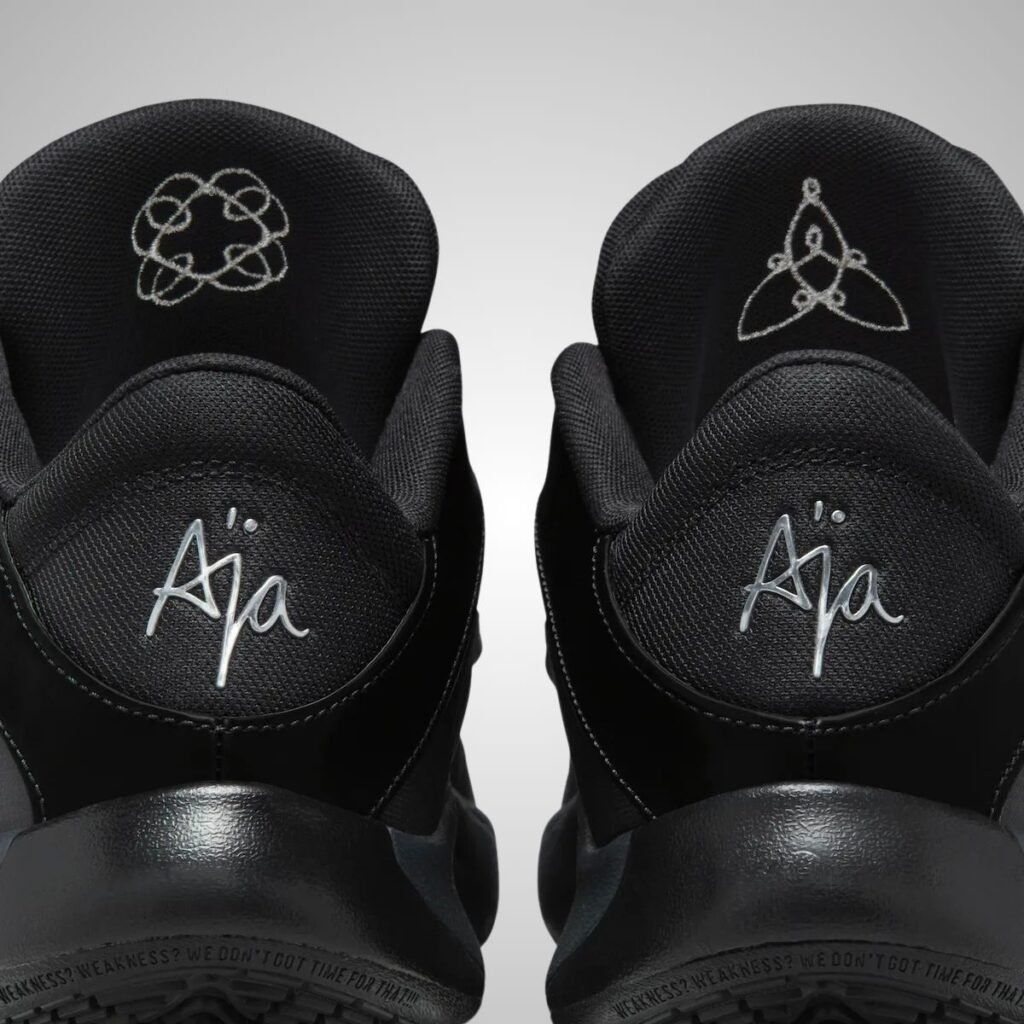 As you can see, this Nike A’One is dressed mostly in all-Black. However, the pair features a Black, Dark Smoke Grey, Dark Grey, and Metallic Silver color combination. Highlighted with the traditional layered mesh and synthetic overlays, the shoes feature Metallic Silver on the Swoosh logos, eyelets, tongue branding, and TPU frame on the midsole. The shoes also feature insignias on the inside of the tongues, a nod to her parents. The design is completed with a Black midsole and a matching rubber outsole.