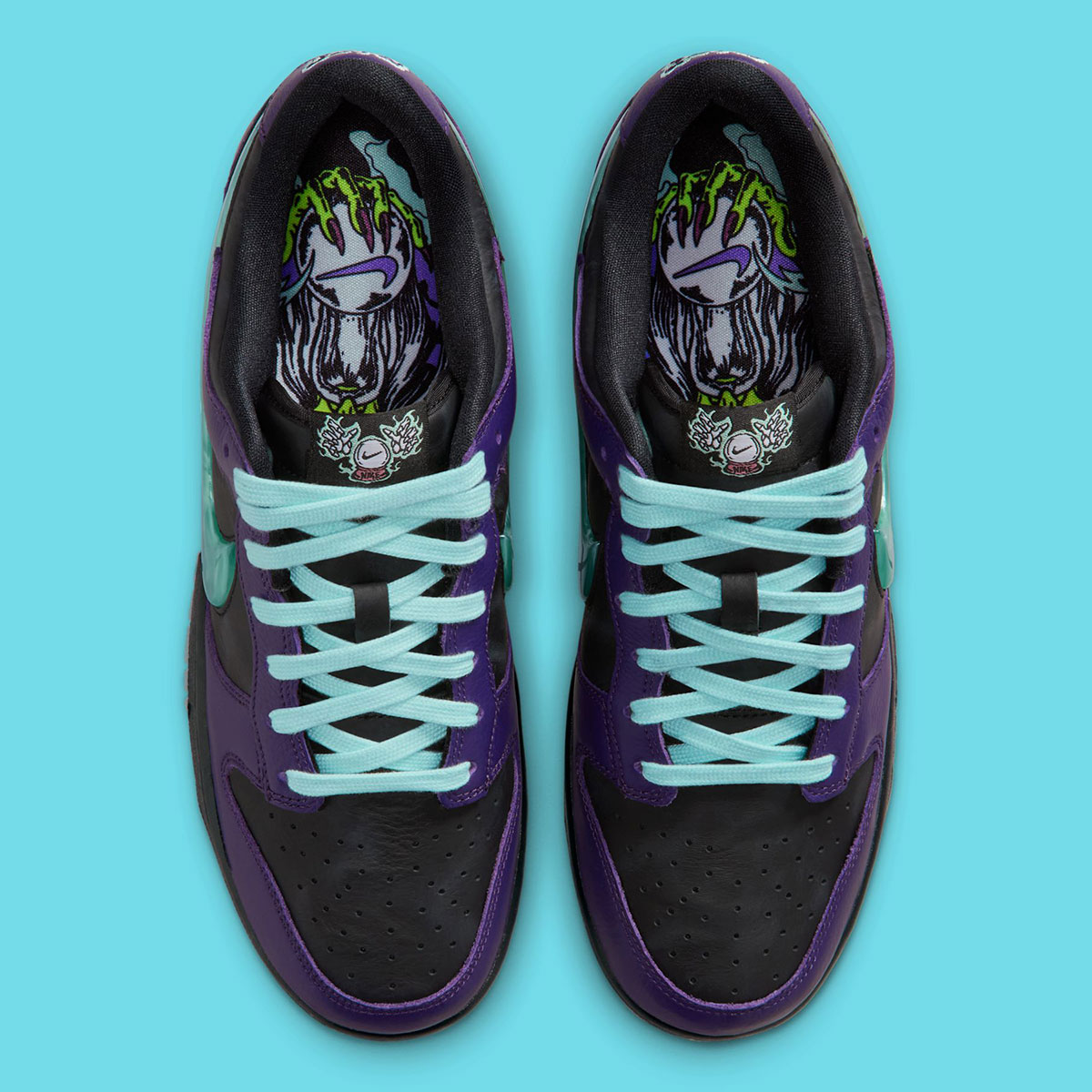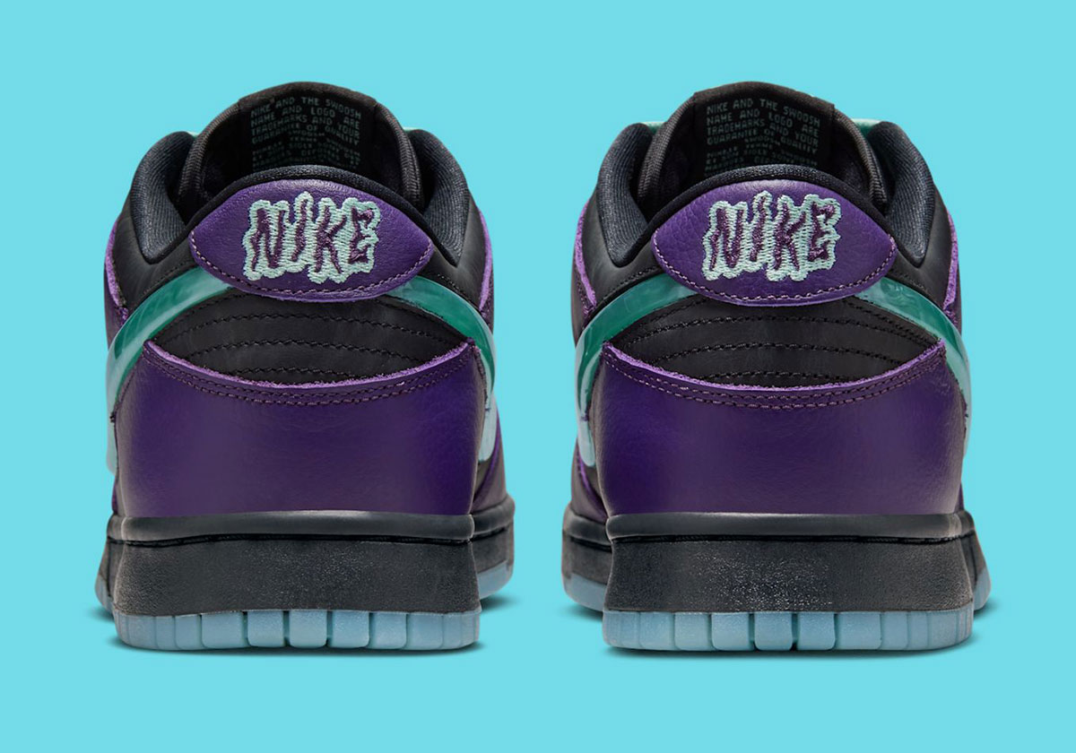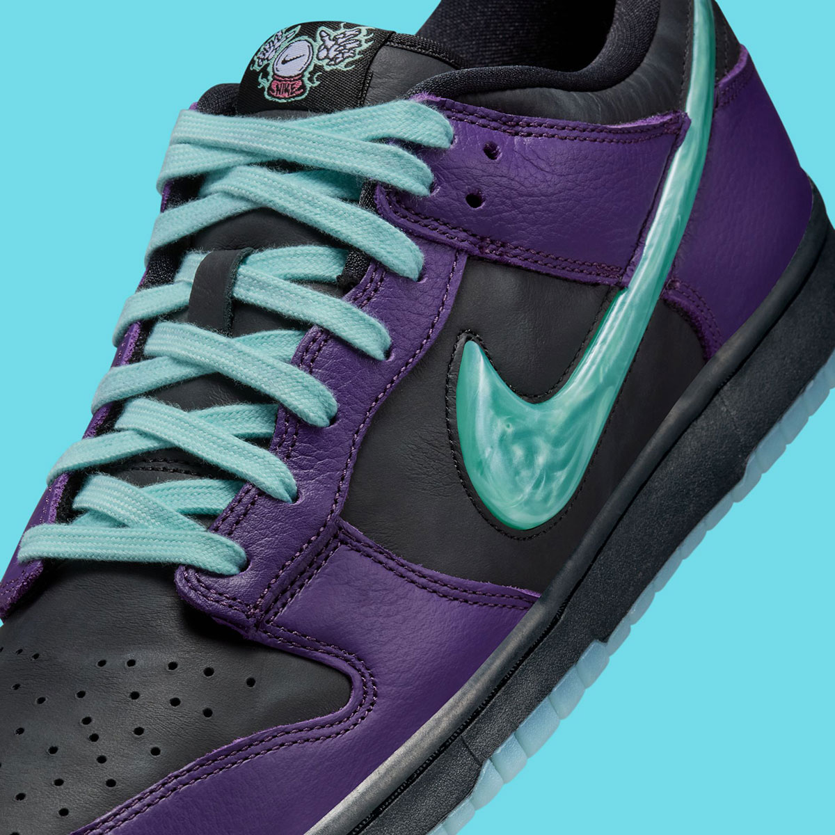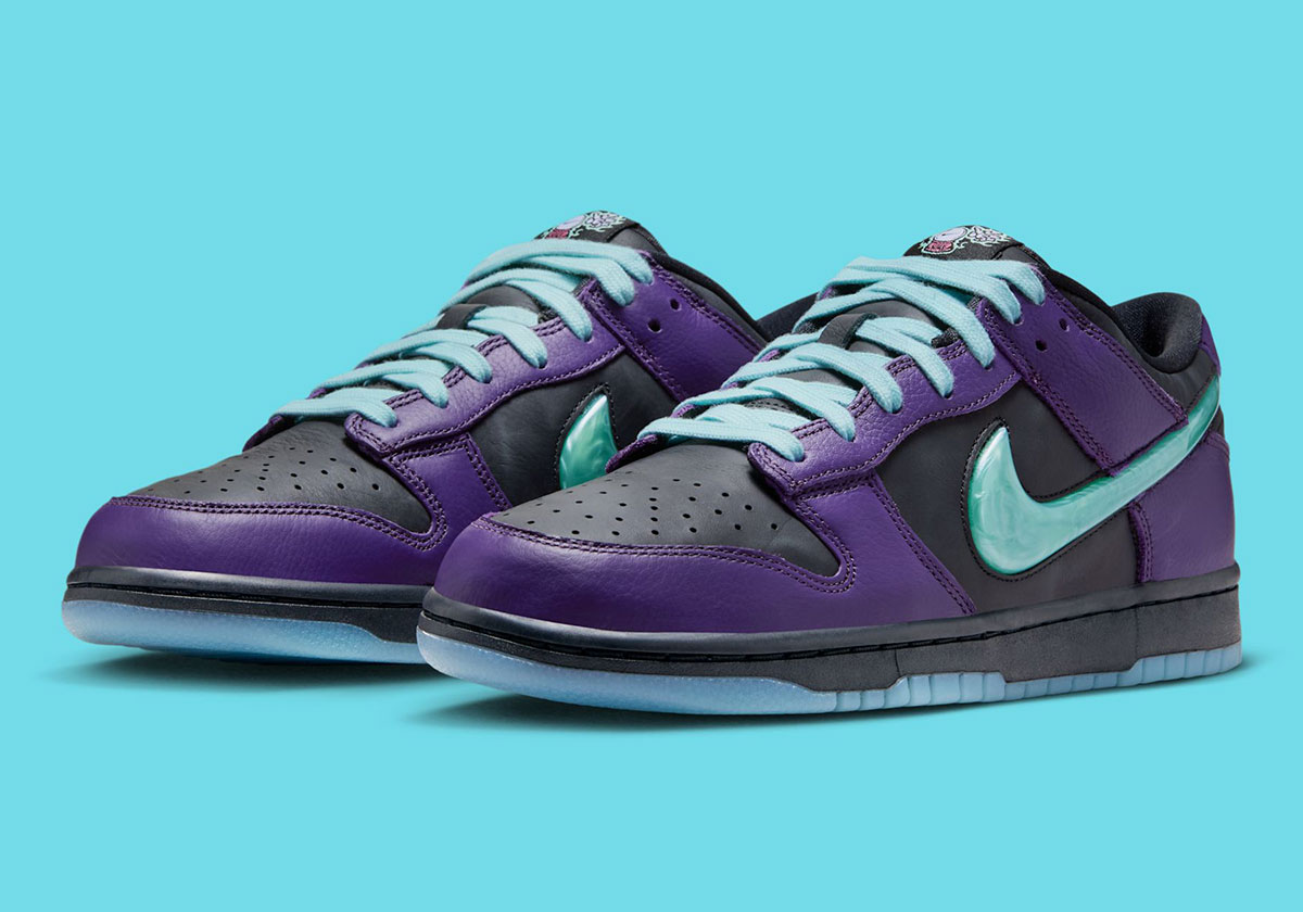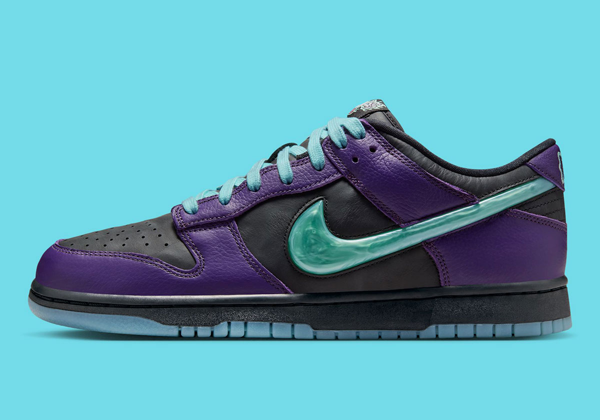 If there were any doubt from the exterior, the insoles make the sneaker’s design theme clear. Nike checks in with a multicolor graphic of a green wizard gazing into his orb, which features a Swoosh logo. The theme continues on the tongue tags with more orb graphics flanked by hands on both sides, as well as on the backtab through wavy, mystical-looking Nike text. The defining feature, however, is the Swoosh logos, which evoke the look of orbs thanks to marbled TPU material in “Artisan Teal.” Black leather underpins “Grand Purple” overlays across the base, while a black midsole and icy blue gum outsole cap off the Special Edition delivery underfoot. This is one of several standout Dunks releasing toward the end of 2025, joined notably by the “Abominable Snowman” Dunks and other key kids’ releases.