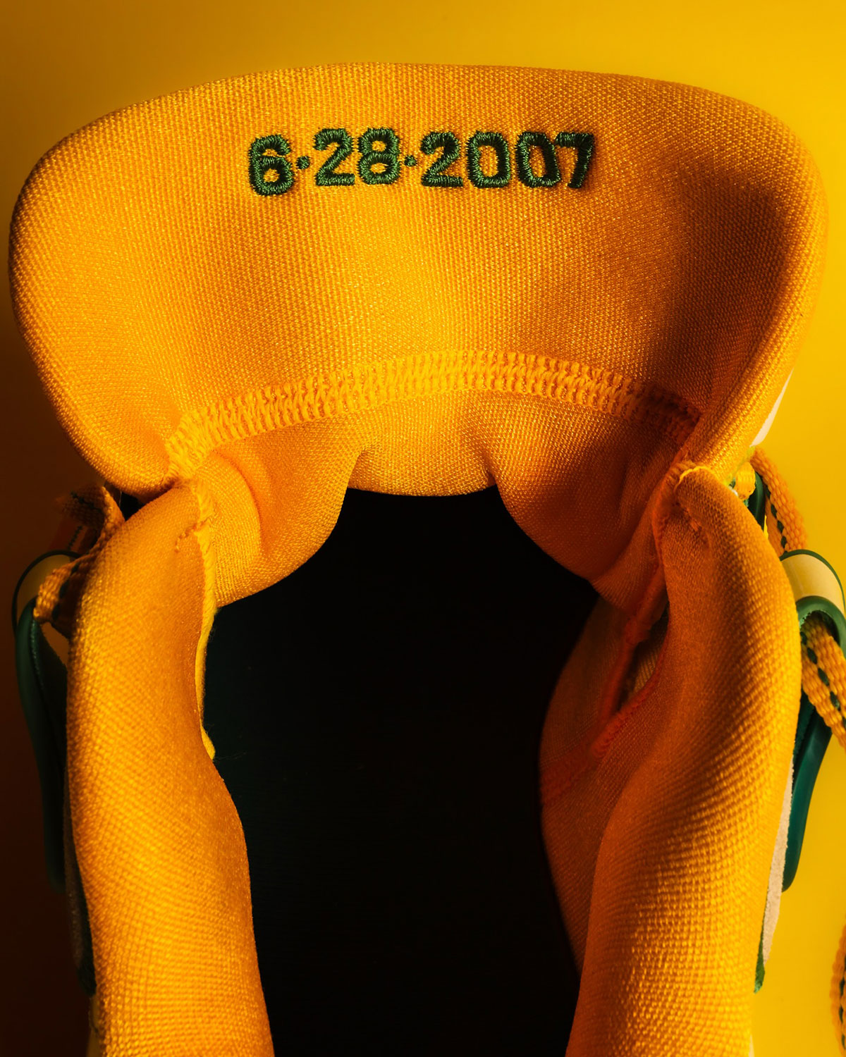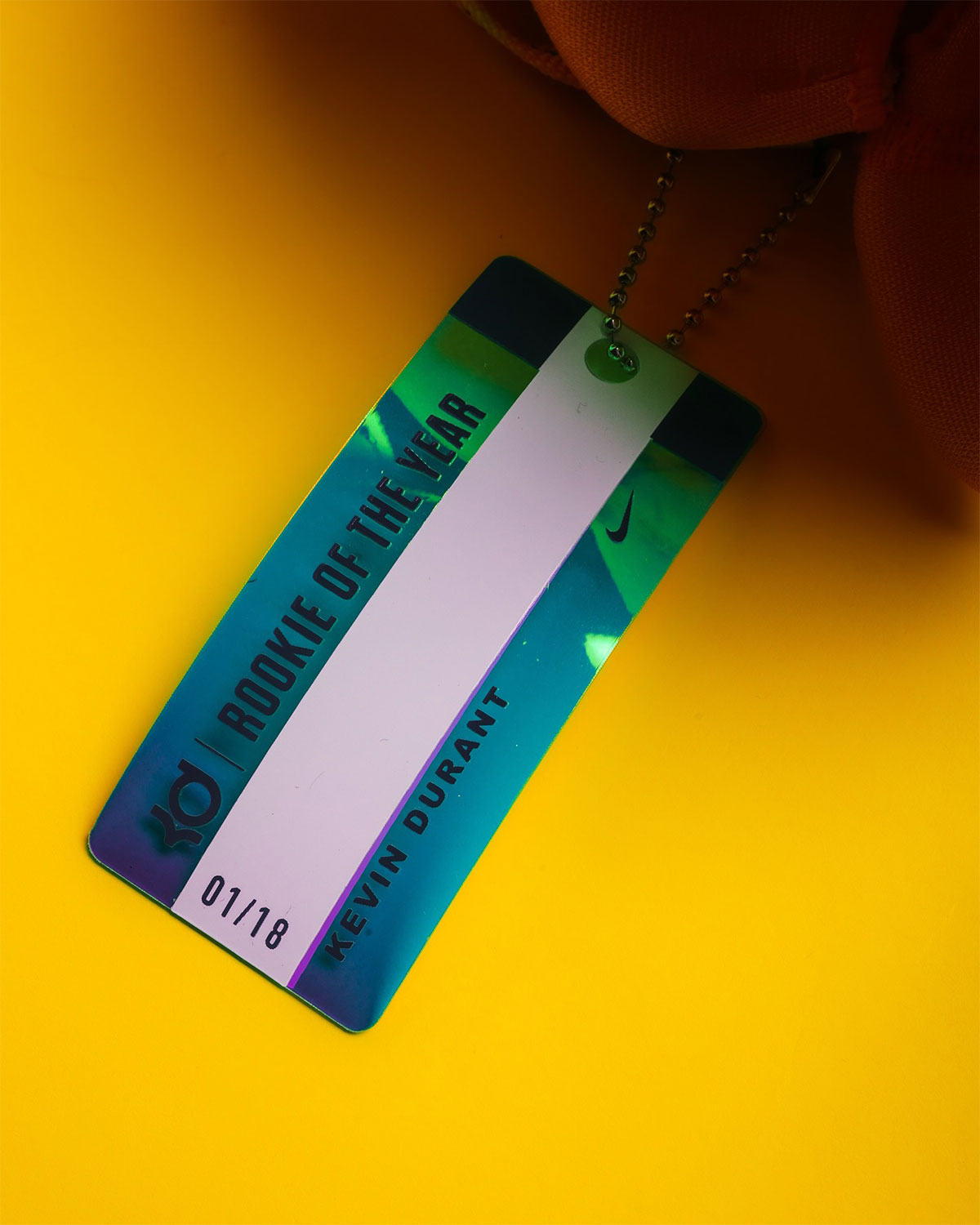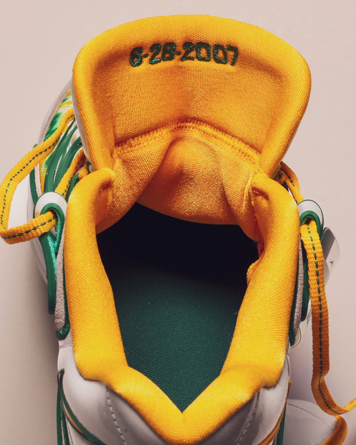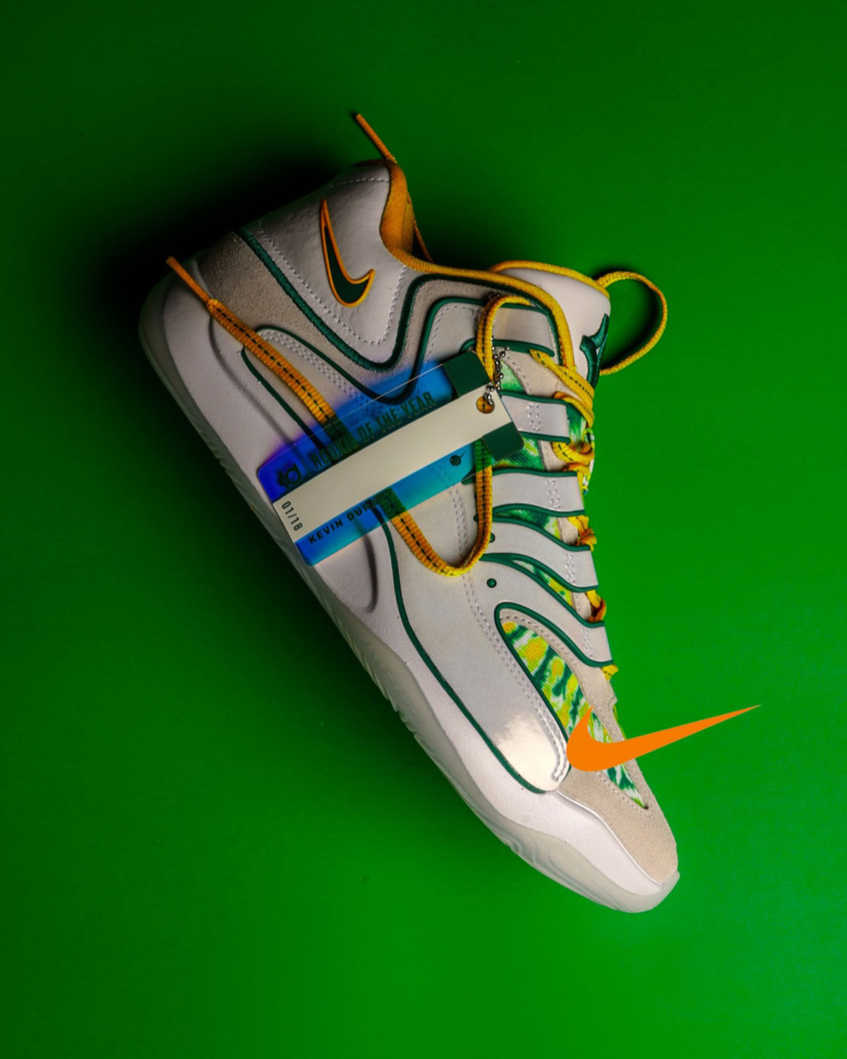 Lost in the mix was a hyper-limited sneaker release that occurred during KD’s appearance. In celebration of hiss eighteen years of service in the NBA and partnership with Nike, the Swoosh created an mega-exclusive 18-pair KD 18 colorway inspired by his rookie–and lone–season with Seattle. Featuring a booming green/yellow/white colorway to match the Sonics uniforms, this collector’s item is decorated with tie-dye patterns as a nod to the Seattle, the date of the 2007 NBA Draft Night, and a Rookie Of The Year logo on the insoles. An added hangtag with holographic striping nods to a specific rookie card from that 2007-2008 campaign.