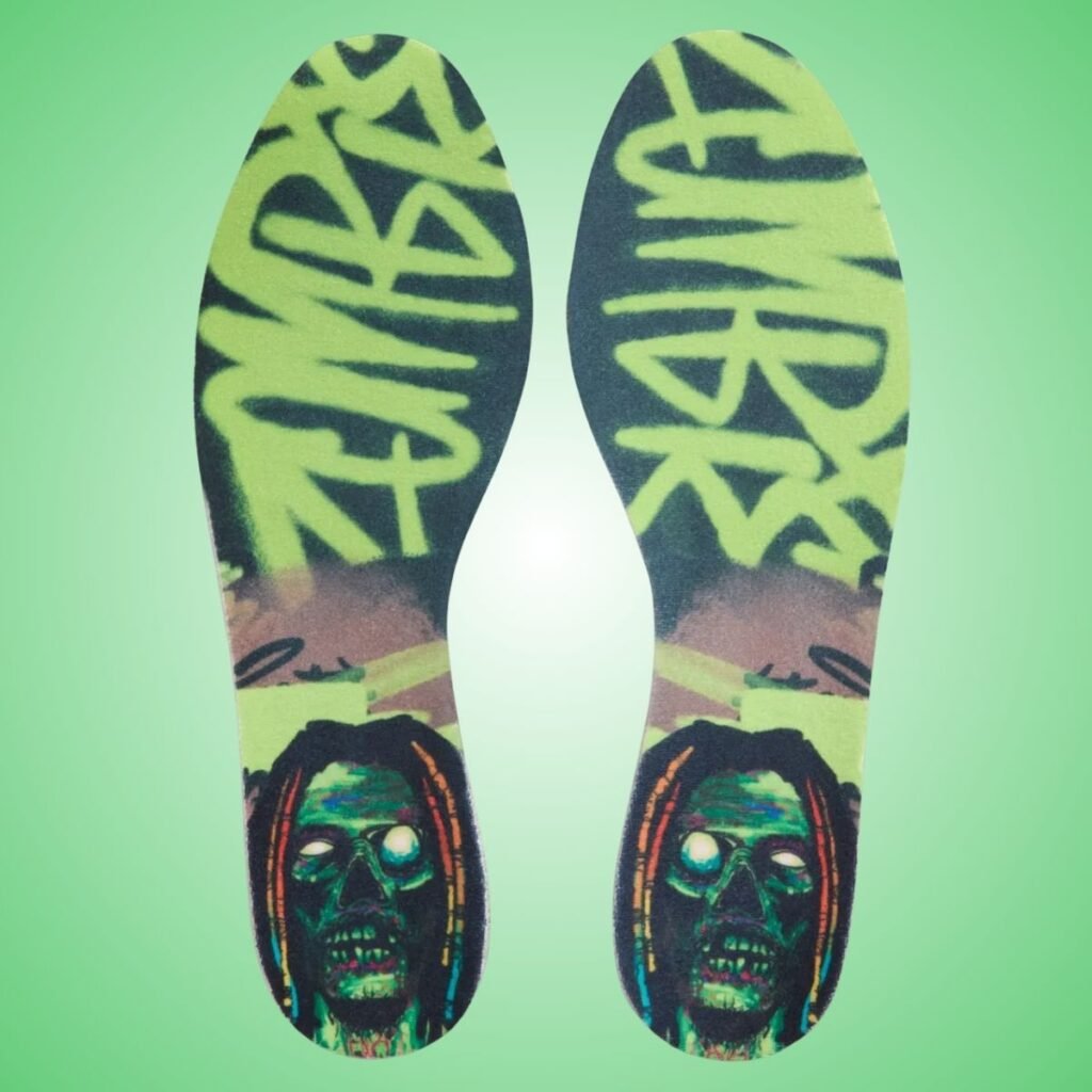 Going over this Nike Ja 3, it features Volt and Green across the upper, which is sure to turn heads. In addition, it comes with the signature tread overlays using Ja’s logo, while the vertical Swoosh is done in Black and outlined in Red. The shoes also come with lace dubraes inspired by Morant’s grill and spell “MORANT.” What makes this pair unique is that the midsole and upper will glow in the dark. To further the Halloween theme, the insoles have a graphic of a zombie with “Zombie” written in graffiti. The design is completed with a glow-in-the-dark Green rubber outsole.