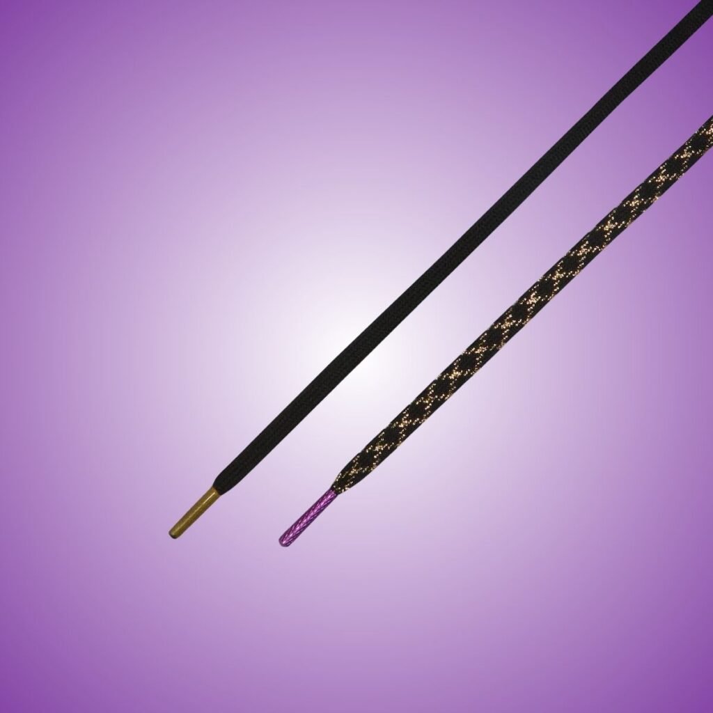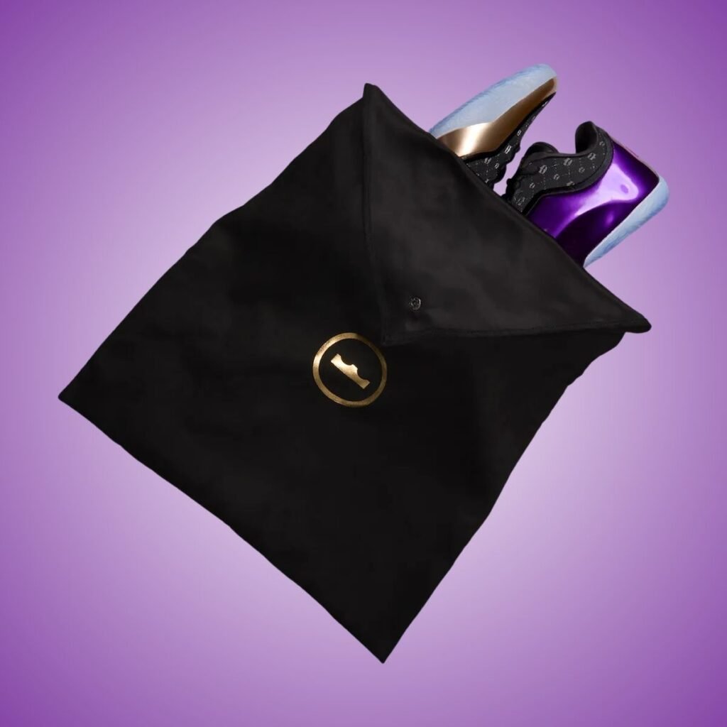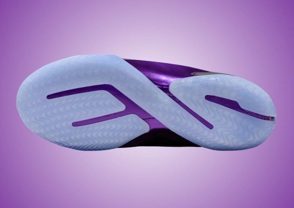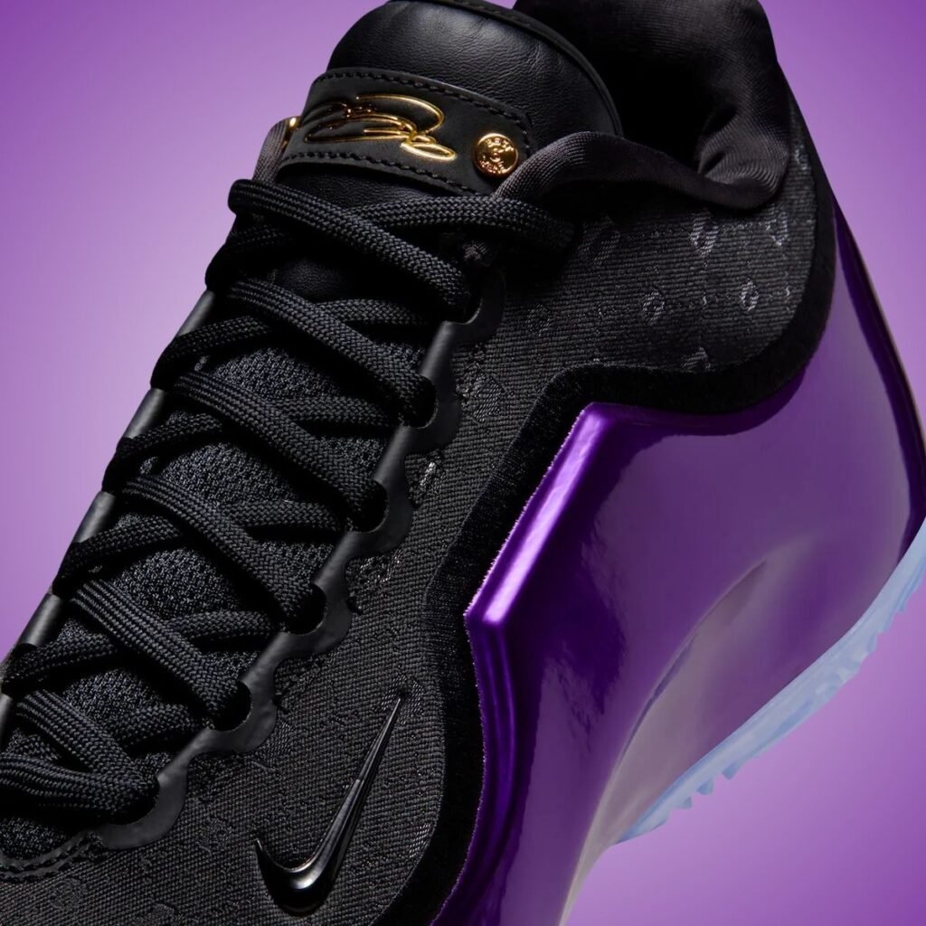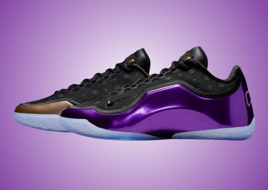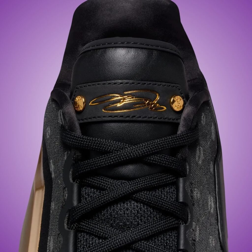 Deep purple has been the Lakers’ primary color since the team moved from Minneapolis to Los Angeles in 1960. The specific shade used on Bronny’s pair appears darker than the Lakers’ standard, creating visual separation between the two shoes while maintaining the team connection. The black woven upper provides a neutral base that lets the gold and purple accents stand out without overwhelming the design.