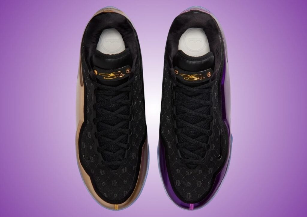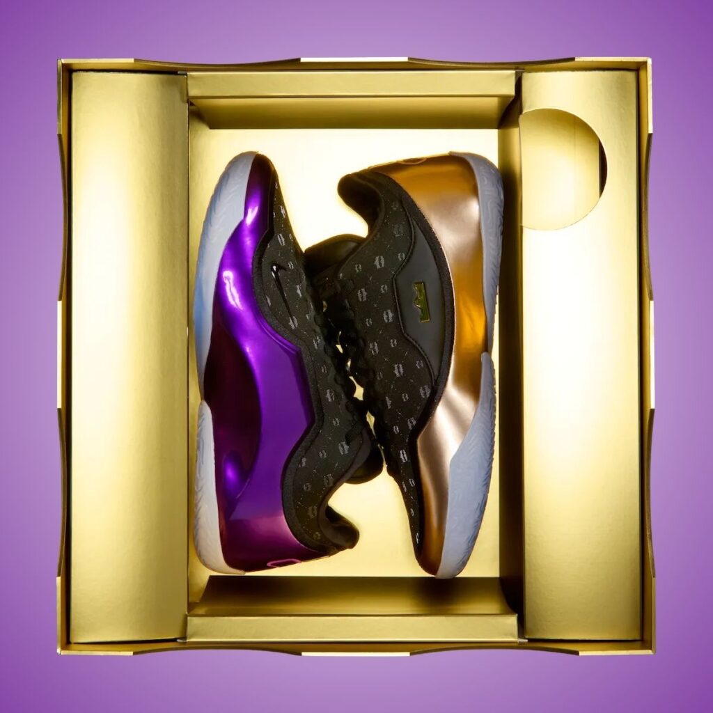 The metallic gold and deep purple color scheme references the Los Angeles Lakers’ purple and gold uniforms. LeBron has won two championships with the Lakers, in 2020 and potentially more by the time this shoe releases. Gold in Lakers context represents the Larry O’Brien Championship Trophy, making the color choice a nod to both team identity and winning.