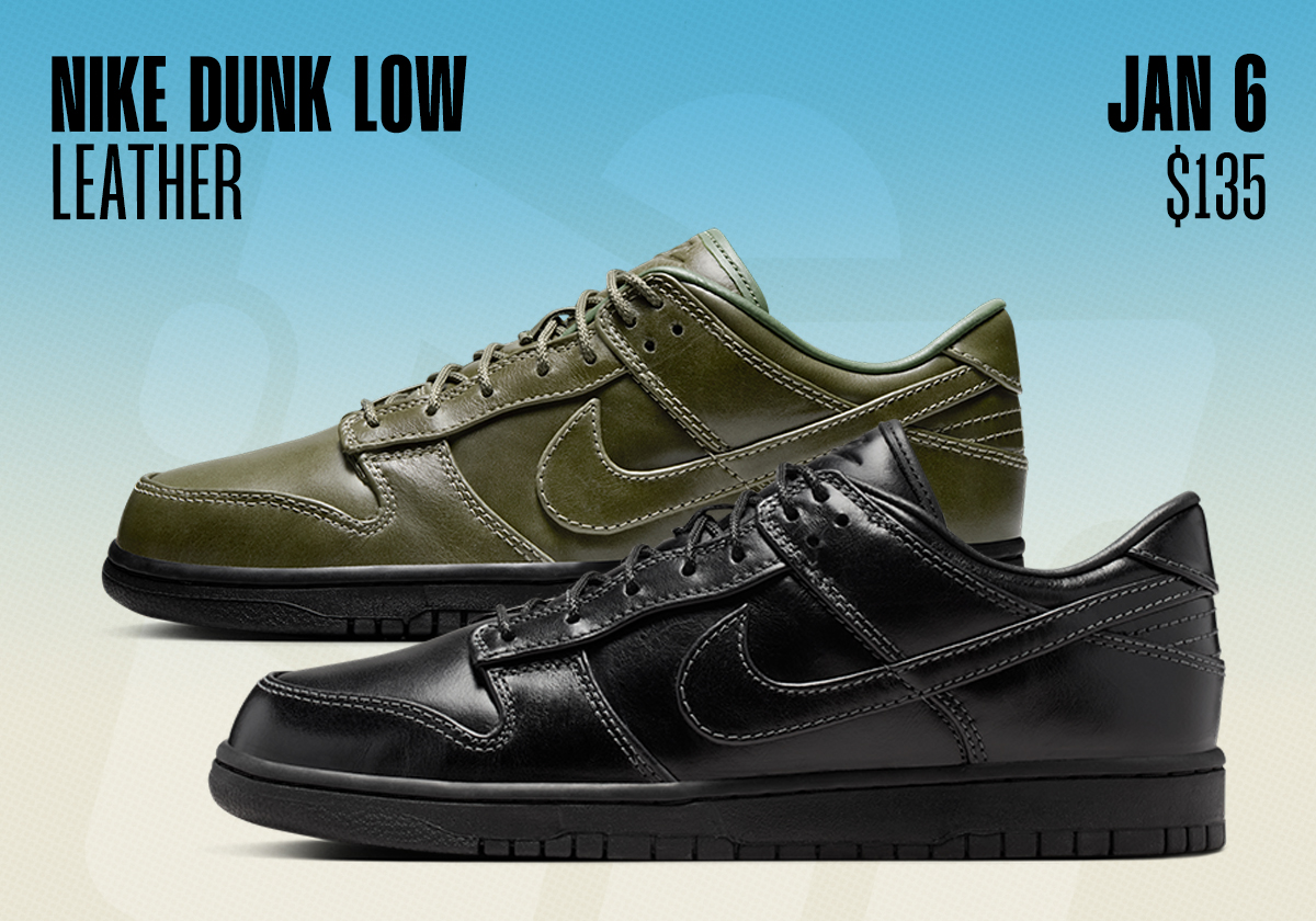 January 6th starts on a classy note, as the Nike Dunk Low Leather goes from lifestyle to luxury. Then it’s to the latest Devin Booker Blazer Low, a tiger-striped homage to Book’s hometown.