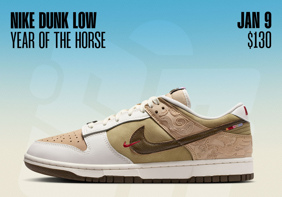 January 9th continues Nike Boot SZN via the Nike Baltoro “Olive Khaki,” but two everlasting street models pen commemorative looks via the Dunk Low “Year of the Horse” and Air Force 1 Low “Year of the Horse.”