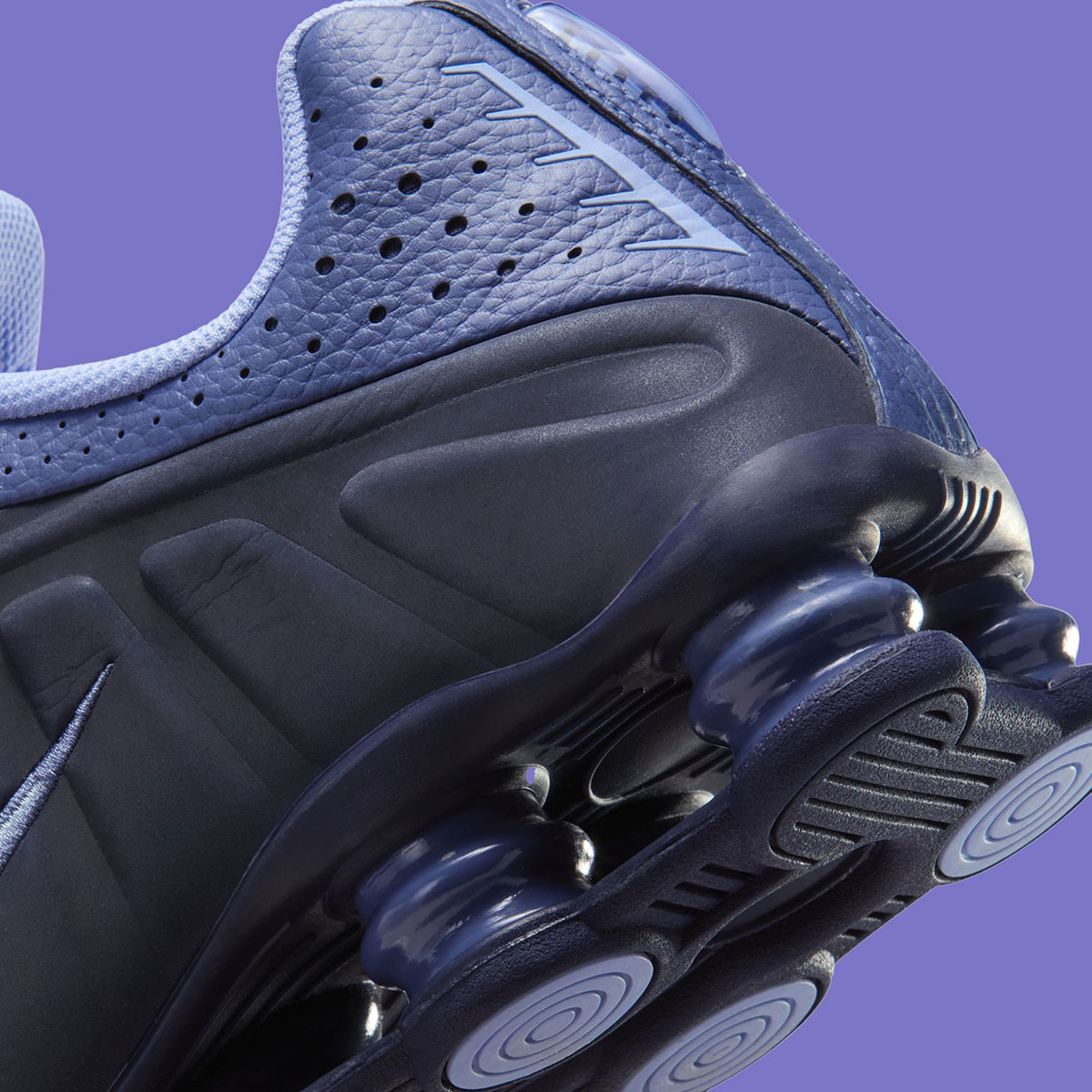 As shown in our hero image, the Shox R4 here features a reflective finish on the tongue, heel detailing, and the entirety of both side panels. There’s plenty to love in normal lighting as well, with the sneaker featuring “Obsidian” leather sidewalls and pebbled “Diffused Blue” leather further up. More “Diffused Blue” accents appear on the stitched Swoosh logos on both sides, as well as the Shox columns underfoot, while the lining arrives in a lighter “Aluminum” hue — ideal for styling with white socks. This is one of two reflective Shox R4s in Nike’s release queue, joined by a “Black/Seaweed” colorway reminiscent of the Northern Lights.