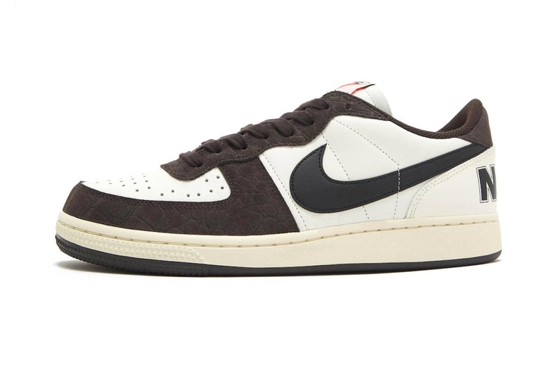 Following the reveal of "NY vs. NY" and "Georgetown" colorways, Nike is adding to its takes on the Terminator Low with a "Brown Croc" lifestyle makeover. Expected to arrive sometime this fall, the upcoming release strays from the usual classic sports leaning of the model and introduces an exotic look with crocodile print brown suede.Expressing a mix of "Sail/White/Chocolate Brown/Black," the Nike Terminator Low "Brown Croc" features clean white leather upper bases paired with matching tongues and stamped brown suede overlays. Branding comes in the form of black midfoot Swooshes, tongue tags, "NIKE" at the heels, and printed insoles. Elevating the shoe are off white midsoles paired with contrasting brown rubber outsoles.Priced at $120 USD, the Nike Terminator Low "Brown Croc" is now set to release in the coming months.For more footwear news, Ewing Athletics and Crashboys International come together for a Sport Lite release. Click here to view full gallery at Hypebeast