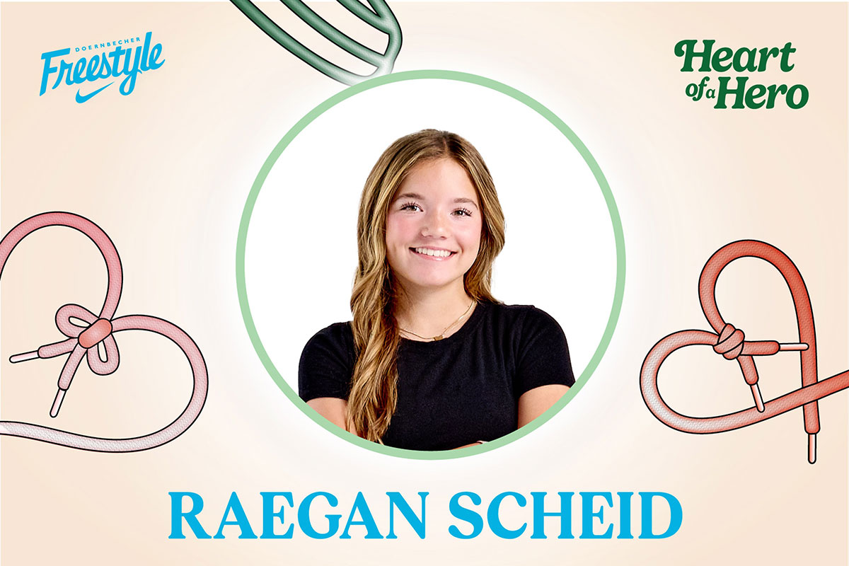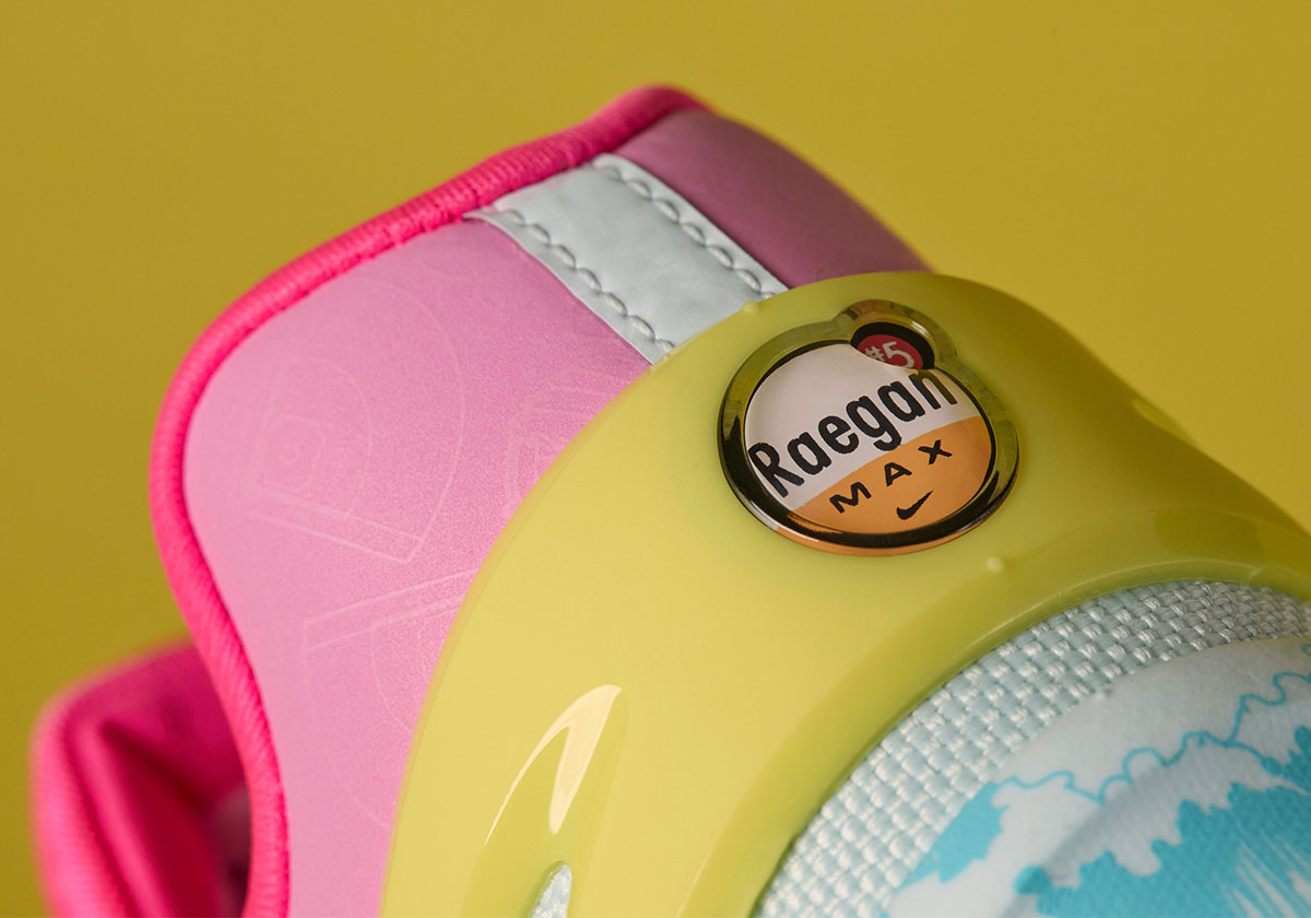 Raegan Scheid was inspired by her love of softball for her Nike Air Max DN8. Baseball stitching is laid onto each of the Dynamic Air chambers, while refreshing blue on the upper remind her of her happy place–the beach. Motivational words appear on the insoles–a reminder of her journey to recovery.
