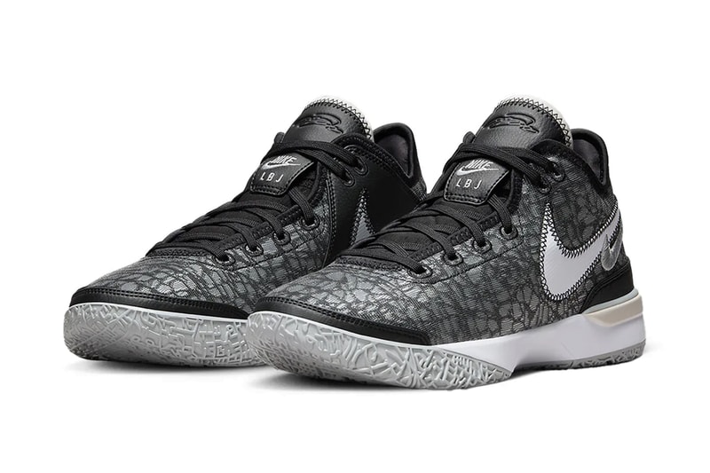 The shoe is dressed in a mostly black and grey mesh upper as the base while the laces, tongue and inner lining are in jet-black. The shoe sits atop a crisp white mudguard that matches the Swoosh on the lateral that contrasts the greyscale secondary mini Swoosh. Additional light grey details are added to the trim of the tonguew as well as the underfoot. The shoe sits atop a grey rubber outsole to round out the design while the "Nike LBJ" branding is seen on the tongue.