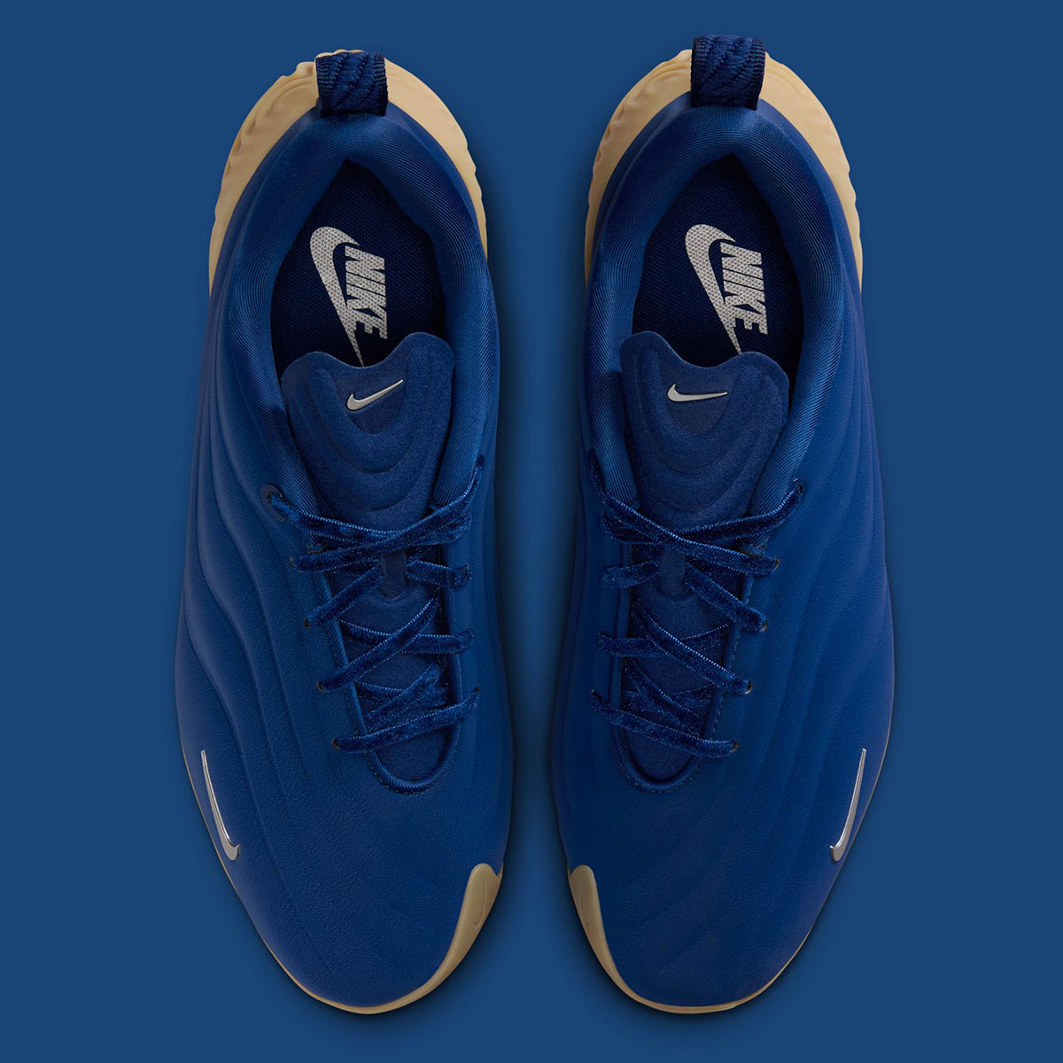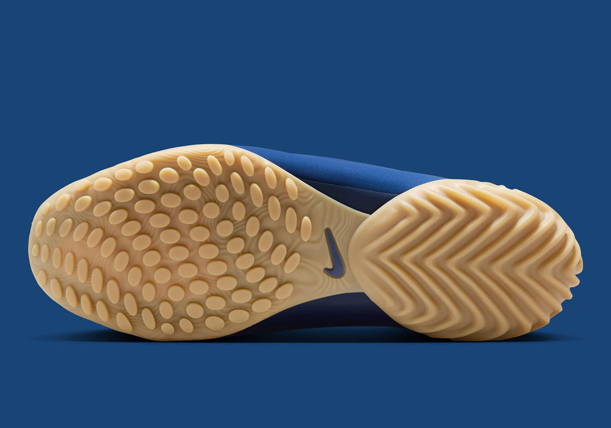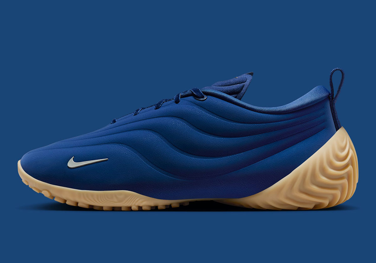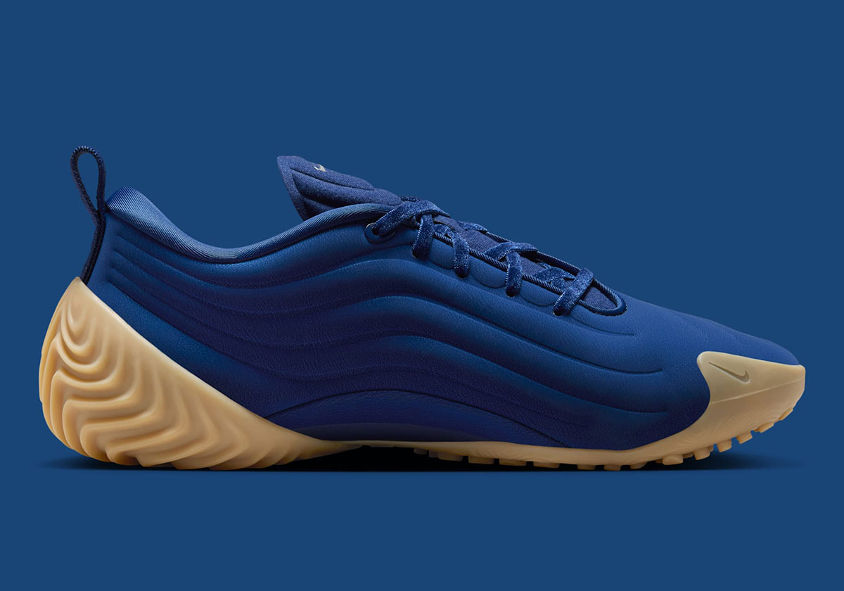 Given how bold of a claim that is, certainly more information will become clear as the silhouette’s run continues on, but we can comfortably assert that the wavy hallmarks that run throughout this shoe are at least partially what’s referenced there, especially eye-catching with the fingerprint-like curvilinear traction that creeps onto the upper towards the heel. For this pair in specific, the general aesthetic of the debut pair lives on, palette swapping into a lighter gum sole underfoot and cooler “Blue Void” up top.