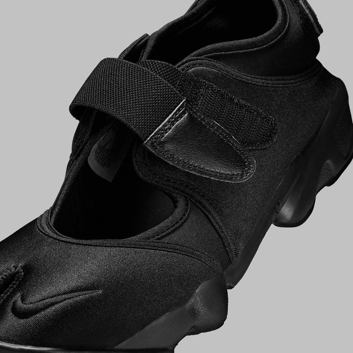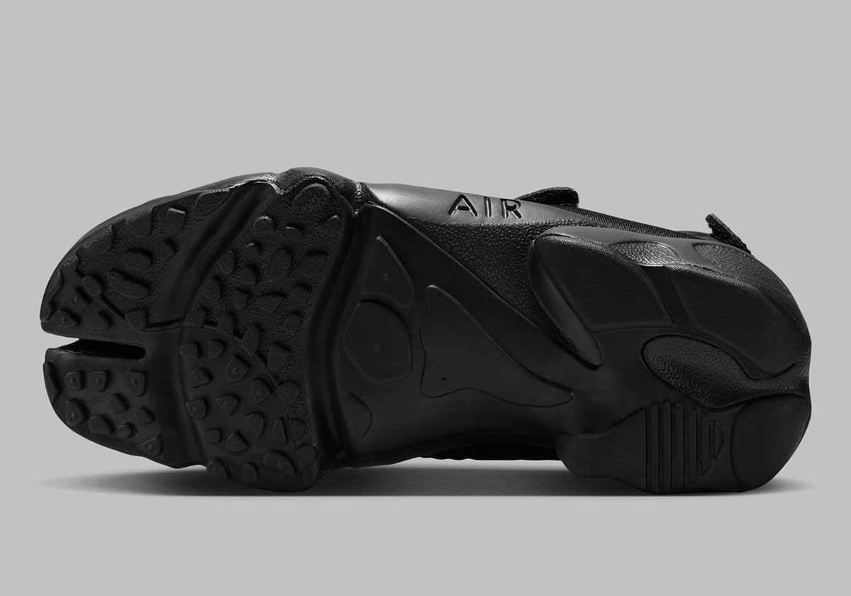 Revisiting a style first seen through a “Soft Pink” colorway in late 2024, the tabi-toed runner is here given long, removable ribbons that wrap around the ankle. The dominant aesthetic is decidedly more moody this time around, with the entire shoe coming painted in black. Compositionally, the Air Rift assumes its standard build with a nylon upper and leather strap ends.