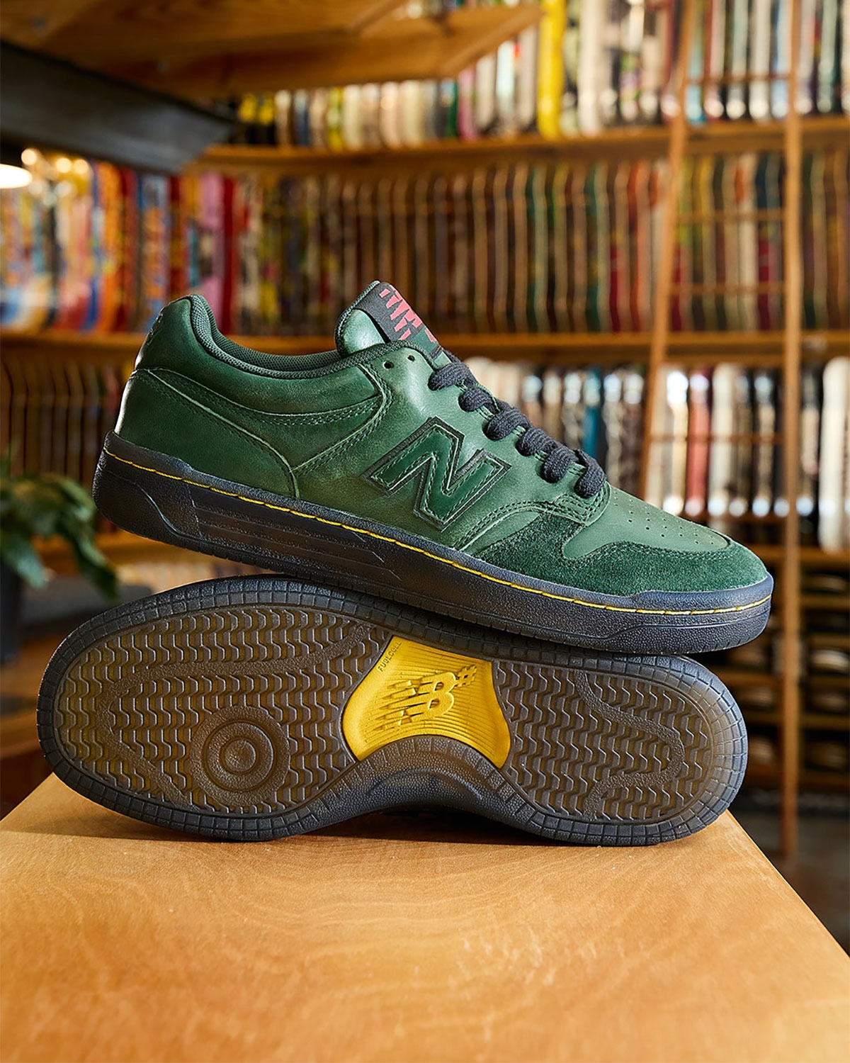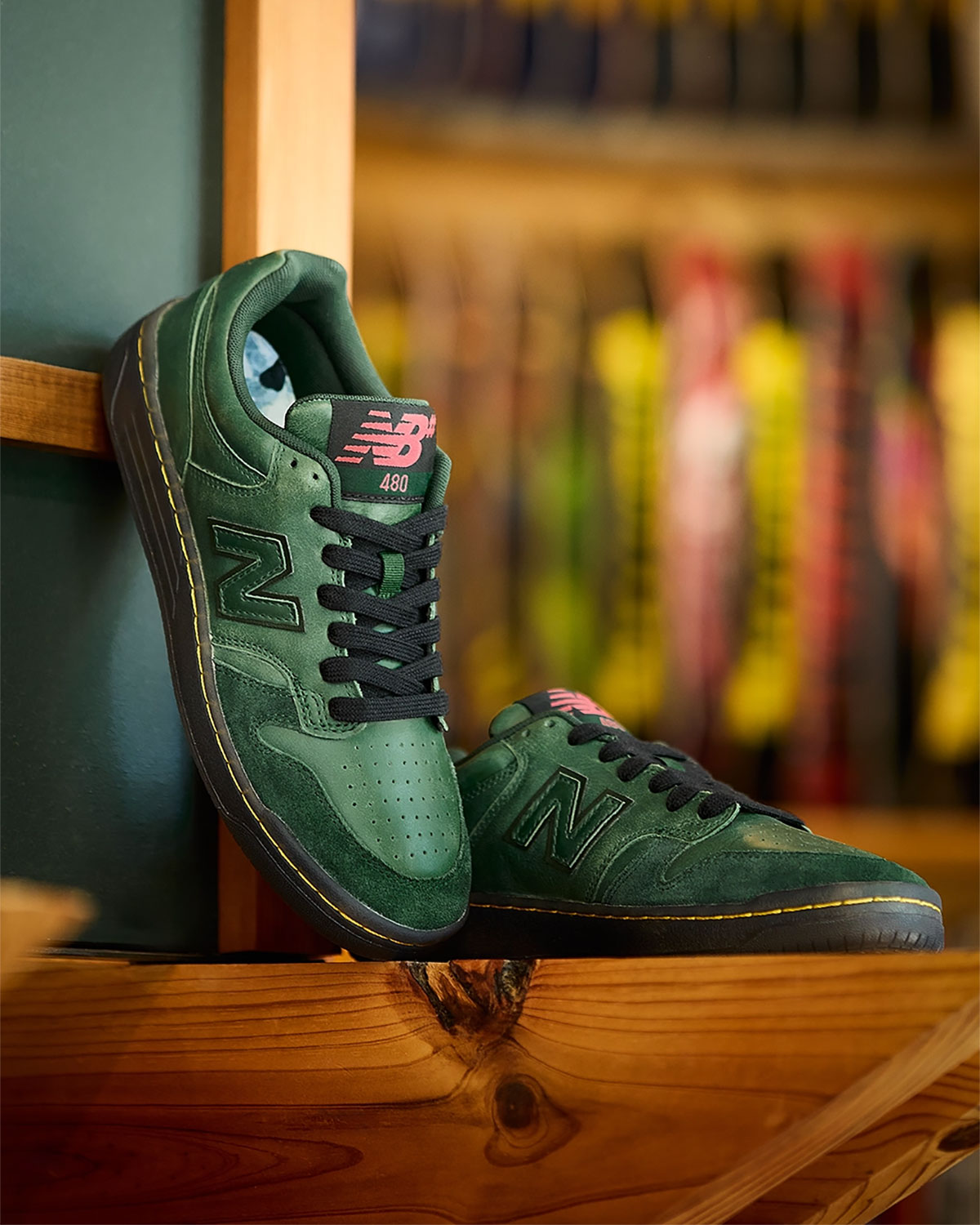 Now, No Comply is checking off a first with its debut collaboration with New Balance Numeric, working on the Numeric 480 silhouette. The sneaker takes inspiration from the shop’s interior with a slew of thoughtful details. First, a premium green leather upper matches the color of the shop’s walls. The Numeric 480 logo on the tongue draws from the shop’s floor, while gold stitching on the midsole nods to the shelves that stock the store’s extensive deck collection. Custom insoles feature art pulled directly from the fitting room walls, and a debossed No Comply logo lands on the heel tab.