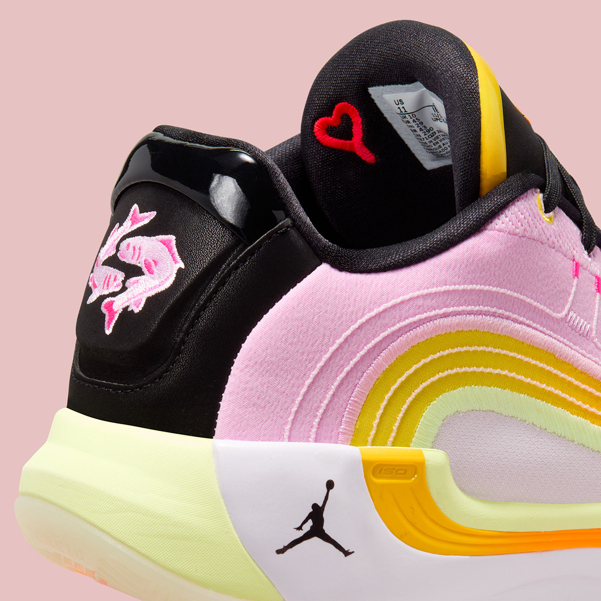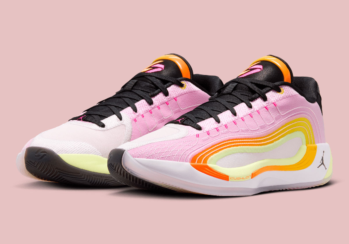 Focus is heightened on the model’s defining quality; a series of rippling ovals that encompass the lateral side. Shades of pink, light green, and orange provide cohesion between the midsole and textile upper, complemented by a grey toe box and black on the tongue/heel/lining. The design plays off two references, the main one being Luka’s love for fishing, boating, and getting outdoors in general. As such, Luka’s signature logo is altered to look like two mingling fish. The other inspiration, while rather ironic given recent events, is sending opponents packing after playoff losses. On the performance side of things, the Luka 4 stands out with Cushlon 3.0 and Zoom Air cushioning as well as an isoPlate system for support.