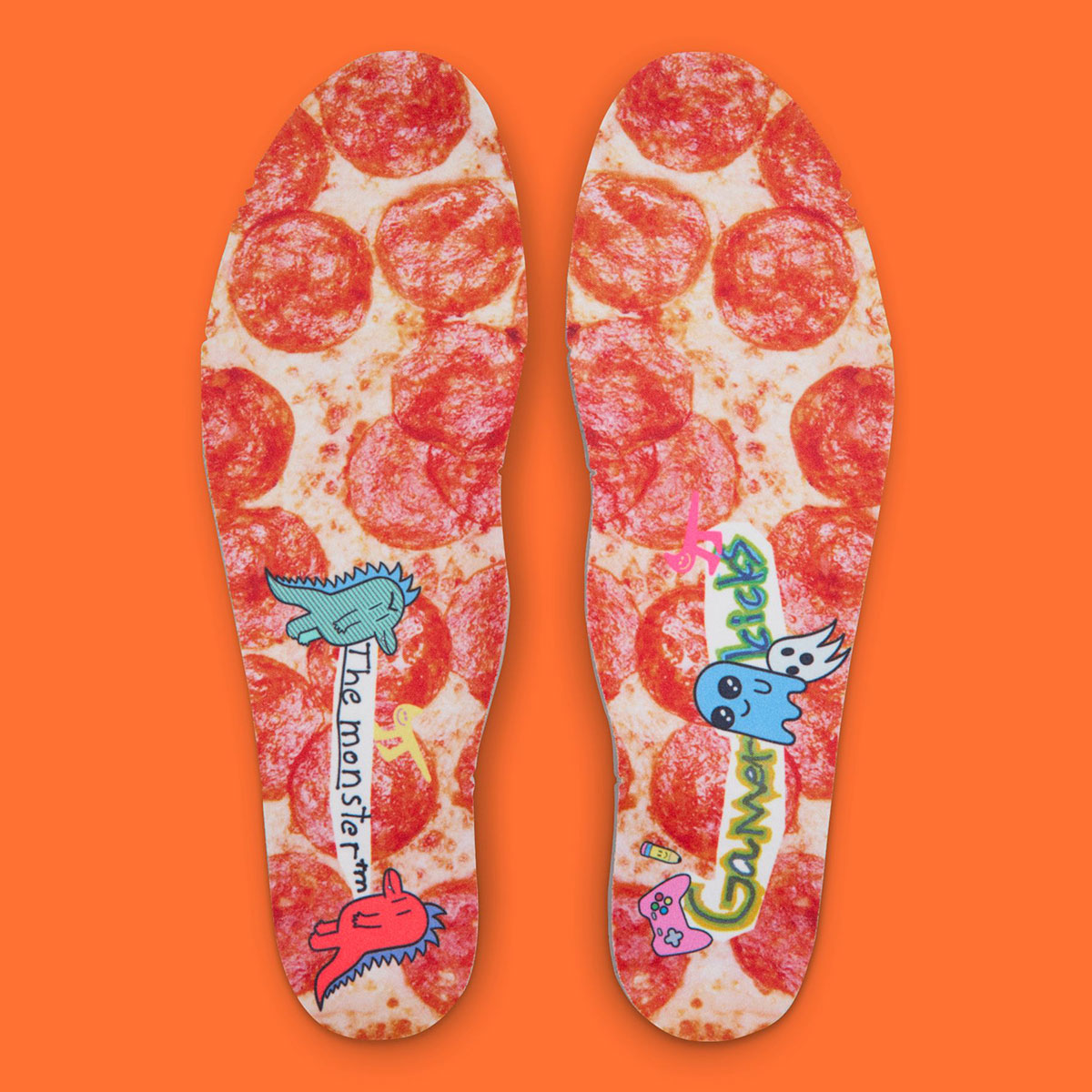 The pair arrives mismatched, with a black right shoe and a white left shoe. The black shoe reflects Sergio’s love for gaming and drawing, featuring controller graphics, Tetris-style patterns, and colorful illustrations of pencils, friendly ghosts, and rocket ships. The white shoe is even more imaginative, depicting monster lizards enjoying a pizza party against a vibrant New York City skyline. Pizza-inspired insoles add another playful touch, while pebbled orange leather on the tongue nods to Sergio’s love for basketball. Lenticular patches on the tongue reveal the iconic doodled “S” for Sergio’s name, and the “buttons” on the outsole tie back to his favorite gaming controller.