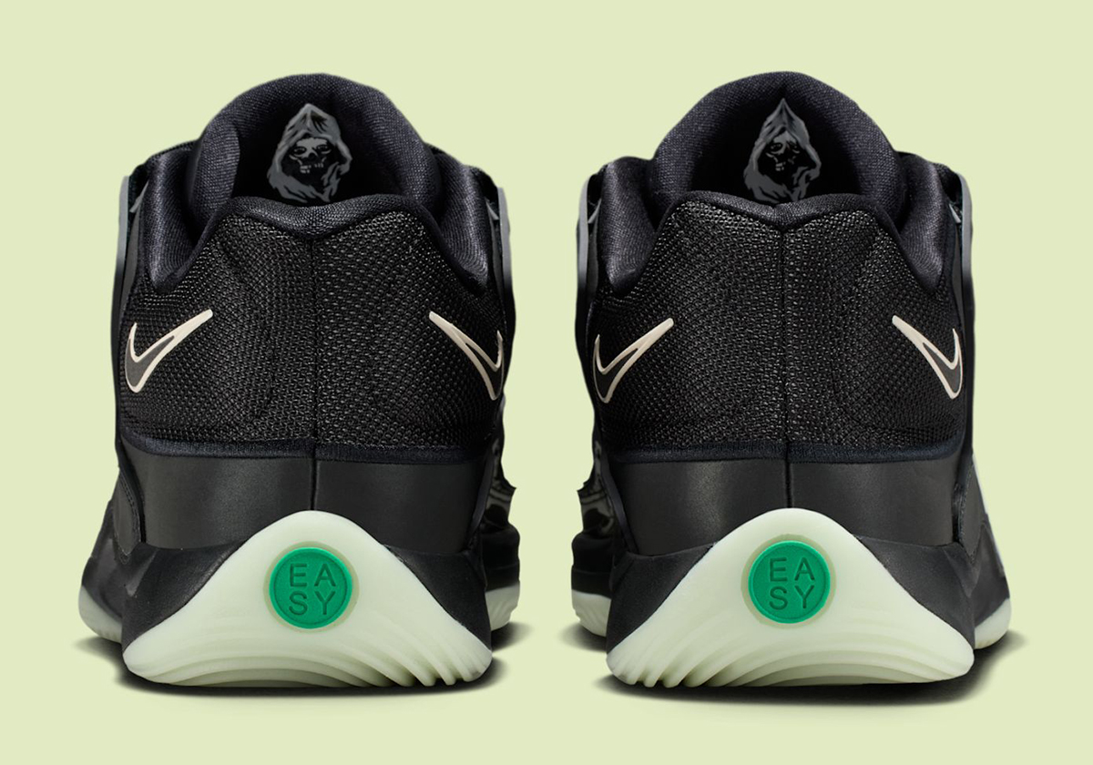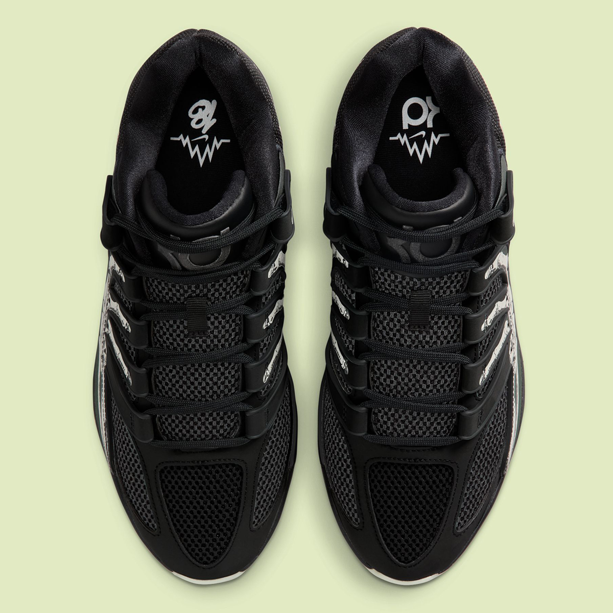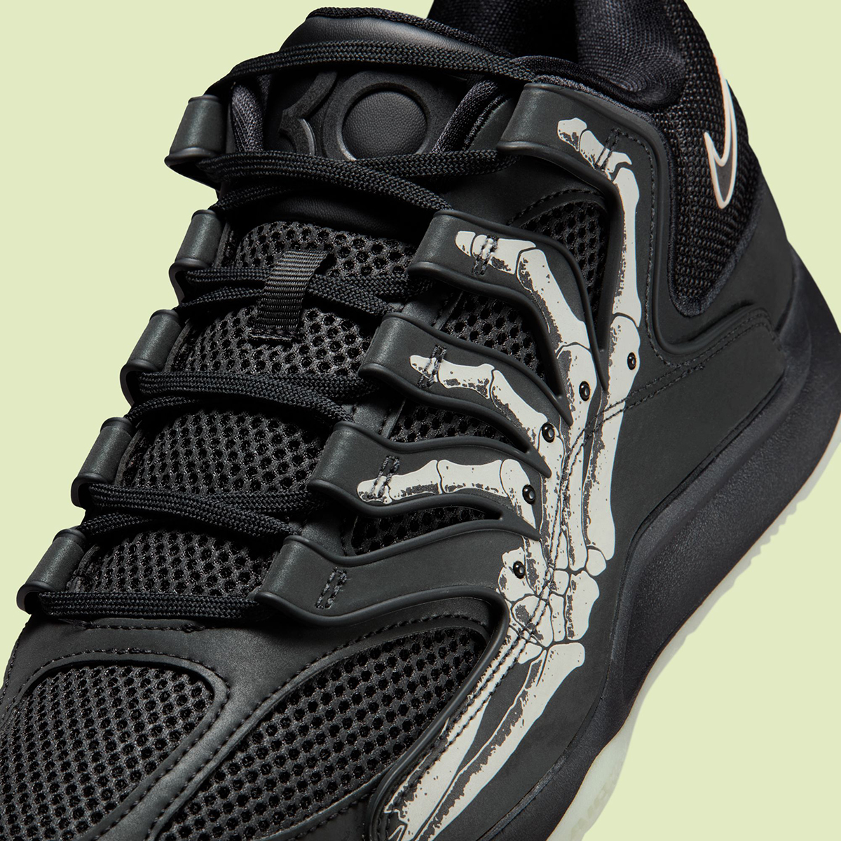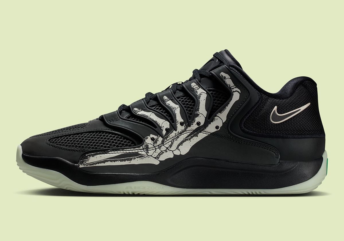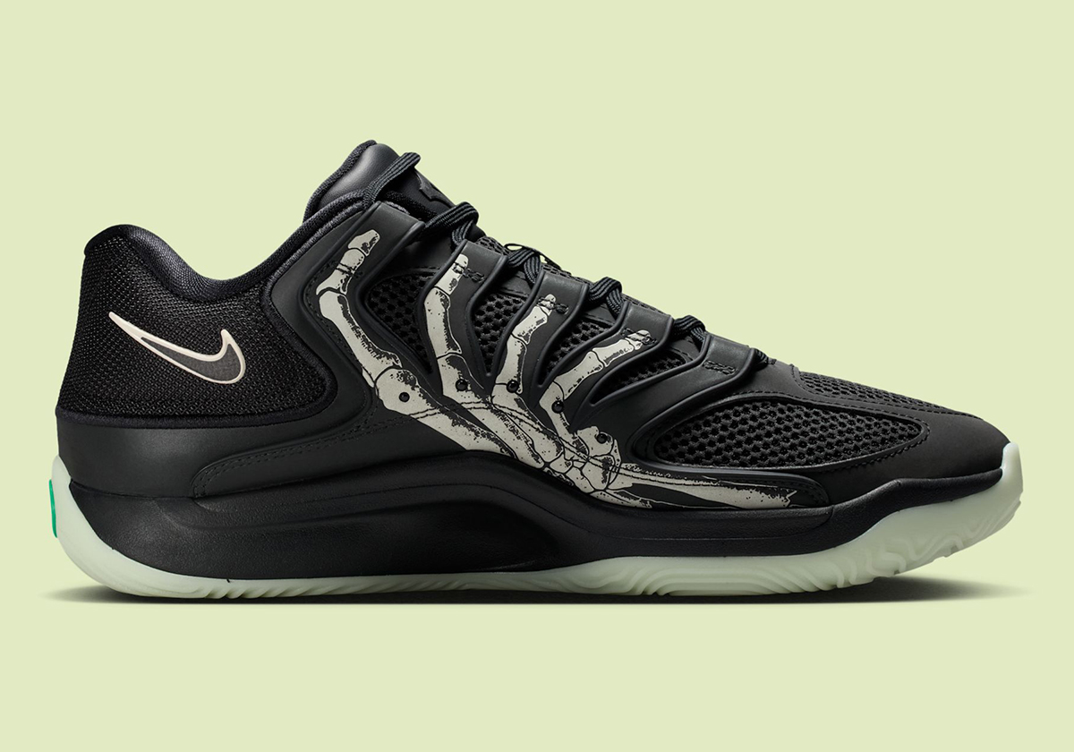In the time since its unofficial reveal, Durant has had plenty of opportunity to put his stamp on this spooky edition. In his first media day as a Houston Rocket, he donned the stealthy pair, going further in saying it’s among his favorite editions of his 18th signature shoe in media appearances shortly after. It’s hard to say our reaction is any different, making excellent use of skeletal aesthetics with a bony hand creeping on the Terra Humara-style cage that defines the model. Further, these official shots elucidate the glow-in-the-dark aspect of this colorway, lighting up that aforementioned detail, the Swoosh, and the outsole.