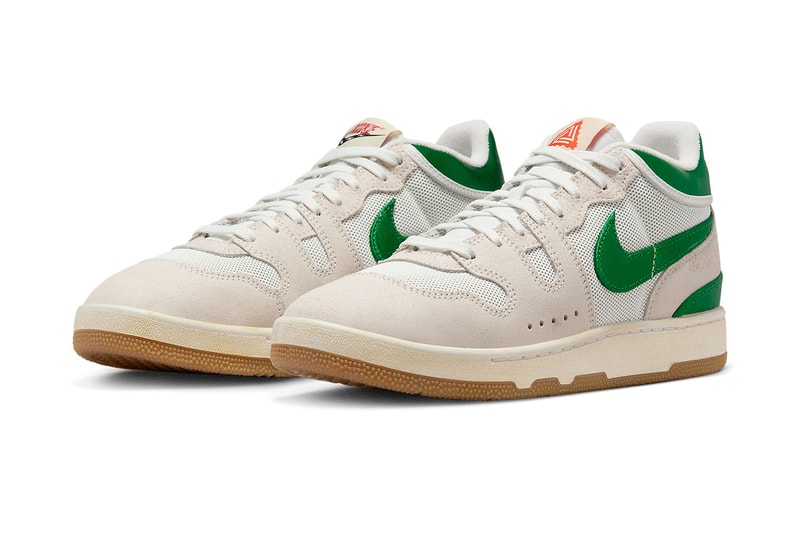 The NBA’s sneaker kingpin P.J. Tucker first teased this offering back in March, but the Swoosh's official images reveal a closer look at all of its details. Uppers are styled with breathable mesh and buttery suede overlays, the former of which comes treated in white while the latter is dyed in an "Ivory" hue. Like its predecessor, the Swooshes here will have tear-away capabilities and conceal a bright "Campfire Orange" layer. Their exteriors are painted with a "Pine Green" tone to match up with the collars and lower heel overlays. Tongues split their branding between Nike hits on the right shoe while a Social Status emblem graces the left side. Down below, the treading is fashioned with gum accents to create a look that's similar to the Nike SB x Air Jordan 4 "Pine Green" collaboration.