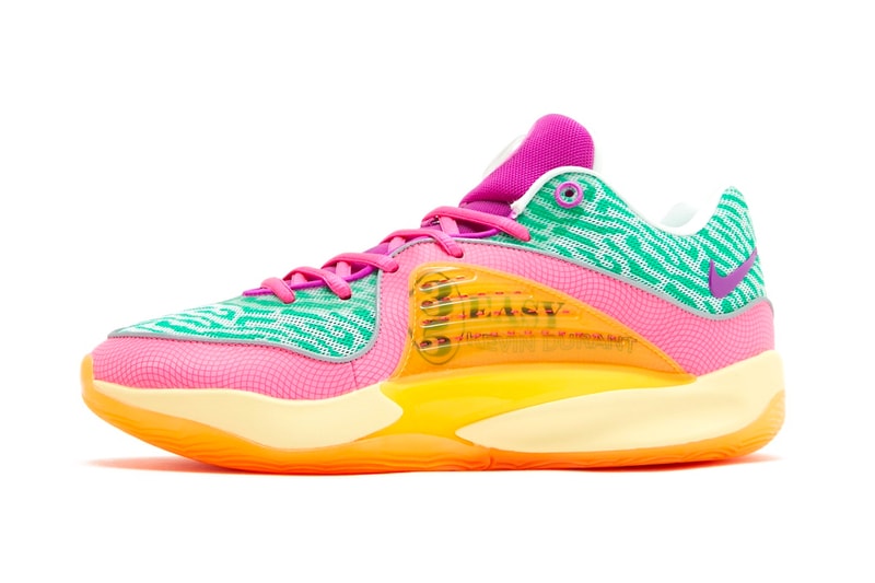 Taking on an abundance of vibrant hues the KD 16 is an ode to Durant's "Easy Money" persona. Constructed with mesh with an upper that is highlighted in green tiger print and magenta and shades of yellow color blocking, the shoe also has a holographic dollar bill on the tongue tab. Durant's name and number are highlighted beneath translucent Orange TPU overlays. The "Easy" theme extends to the insoles and heel tabs while the shoe sits atop a semi-translucent orange rubber outsole.