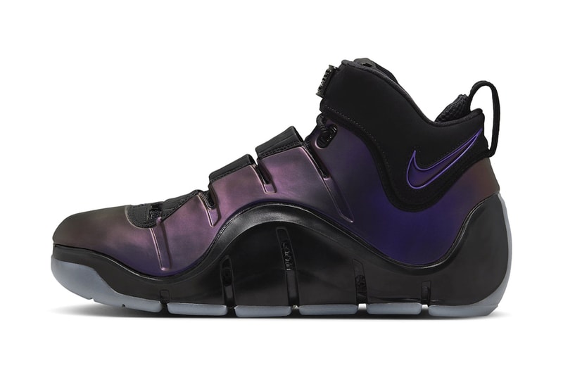 Nike and LeBron James are releasing yet another pair for the Nike Basketball's Summer 2024 series. The Nike LeBron 4 is now slated to arrive in the "Eggplant" colorway, just in time for the summer.Taking on a black, varsity purple and blue tint color palette, the basketball shoe features the Foamposite shell and Swoosh outlines in the varsity purple, giving the shoe an iridescent "Eggplant" aesthetic. Black accents the midsole, ankles, linings as well as the pull tabs, complementing the black translucent rubber outsole that the shoe sits on. The velcro strap is also in black, as are the branding on the tongue.Look for the Nike LeBron 4 "Eggplant" arriving in select retailers and online at Nike for $250 USD later this summer.Click here to view full gallery at Hypebeast
