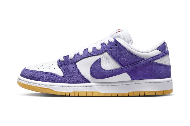 Nike continues to expand its SB Dunk Low lineup for Spring 2023 collection. This time around, the colorway revealed appears to give a nod to the Los Angeles Lakers with the purple overlays and muted sole. The shoe arrives in "Court Purple," mixed in with a white and gum light brown color scheme. The Nike SB Dunk Low features the typical white leather base and mesh tongues, linings, laces and midsole. The court purple is seen on the suede overlays, while the Orange Label is highlighted in the tongue, insole and lace tips branding. The shoe sits atop a gum rubber outsole to round out the design.Look out for the Nike SB Dunk Low "Court Purple" arriving in select retailers or at Nike in the coming months for $110 USD.In case you missed it, Jordan Why Not Zer0.6 "Khelcey Barrs" honors Russell Westbrook's childhood friend. Click here to view full gallery at Hypebeast