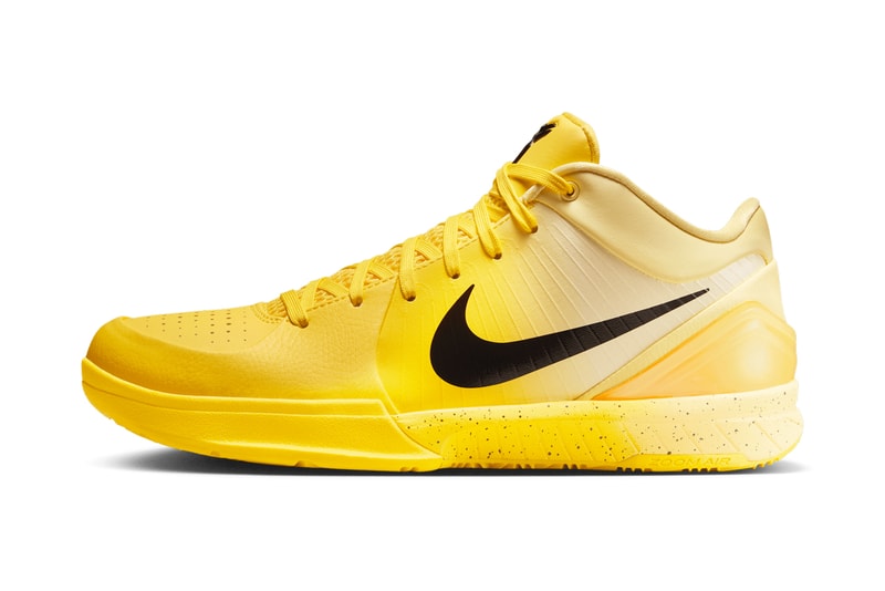 This Nike Kobe 4 Protro "CHBL" colorway has been made for the China High School Basketball League (CHBL), joining the Book 1 in paying homage to the league. While only one image of the kicks has been shared, many key details are visible. Its upper begins with a bold yellow toe and transitions via gradient to a light yellow around the heel while black lateral Swooshes serve contrast. Lacing options look to include both yellow and blue as each set is showcased here. A black version of the Sheath logo at the tongue matches the right shoe's lateral heel signature detail, as well as the specks found across the gradient-equipped midsole.