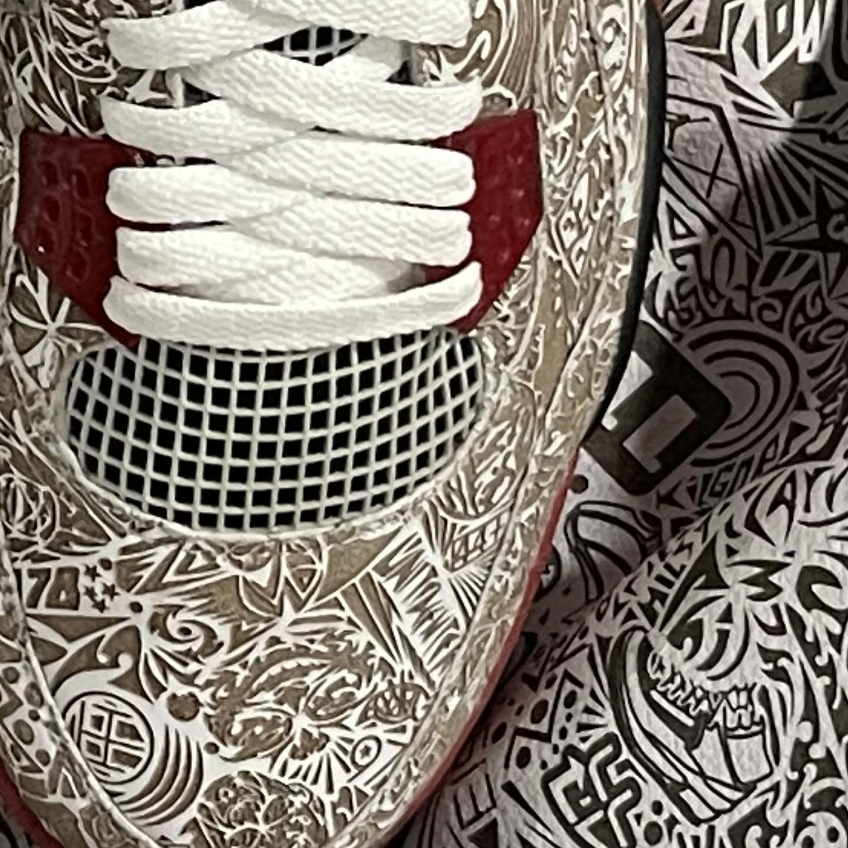 The key difference between this Air Jordan 4 sample and the two made-for-retail versions is the thicker laser-etching that we’ve seen in in the Mark Smith Laser Air Force 1s and even the Entourage pairs. Alongside the shoes is a custom shoe-box and tissue to match, made just for Michael Jordan, former Nike CEO Mark Parker, and Mark Smith himself.