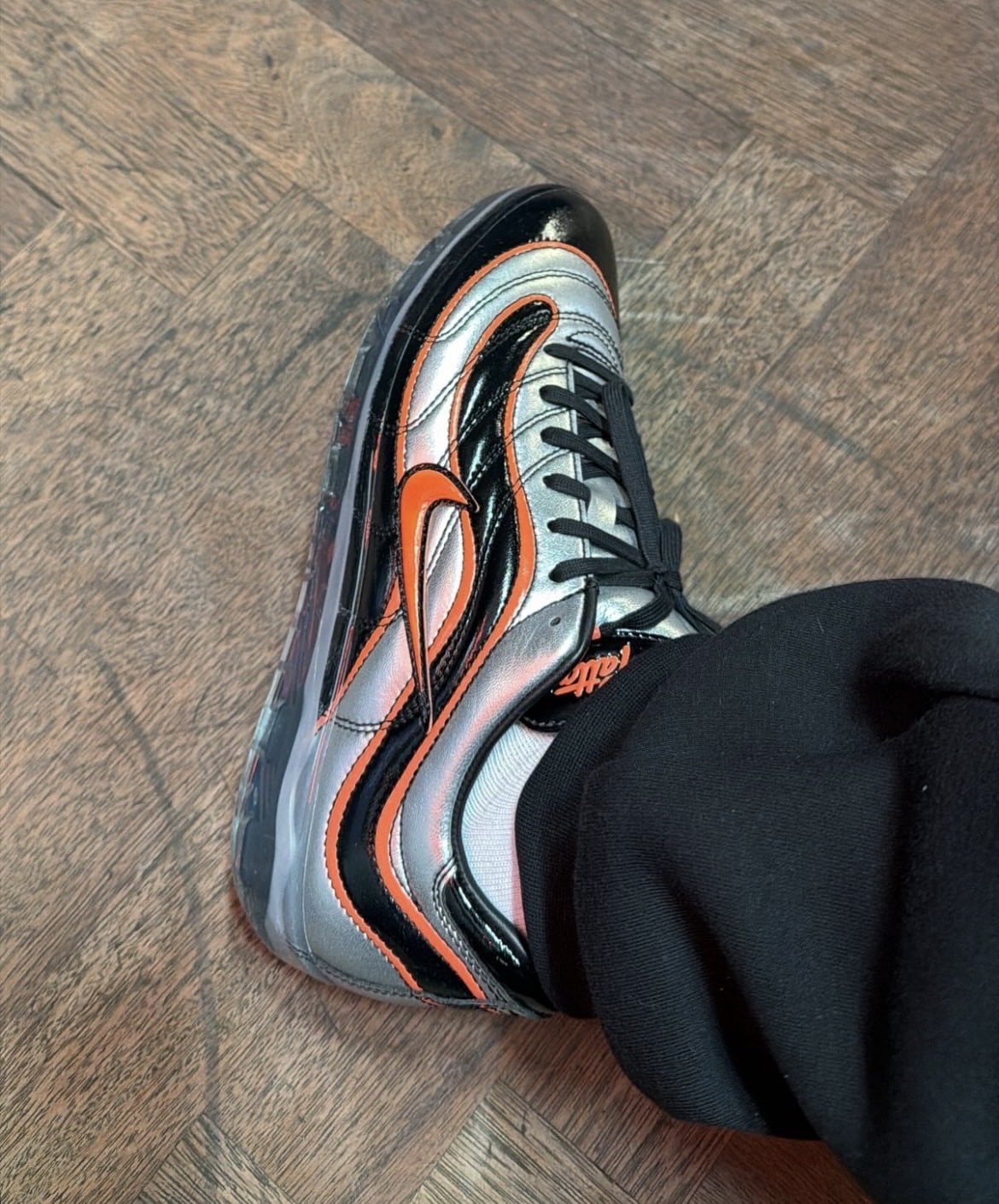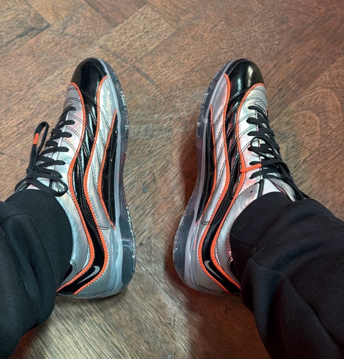 Just a few days after Nike unveiled their CryoShot models, team members at Patta, one of their frequent collaborators, have teased a special edition pair of boots in their own color scheme. Shown in just a few photos, the Patta logo is clearly seen on the tongue of this pair of the CryoShot Mercurial M9. The look comes in glossy black and silver for its wavy upper, adding piping, Swooshes, and branding in a bright safety orange shade.