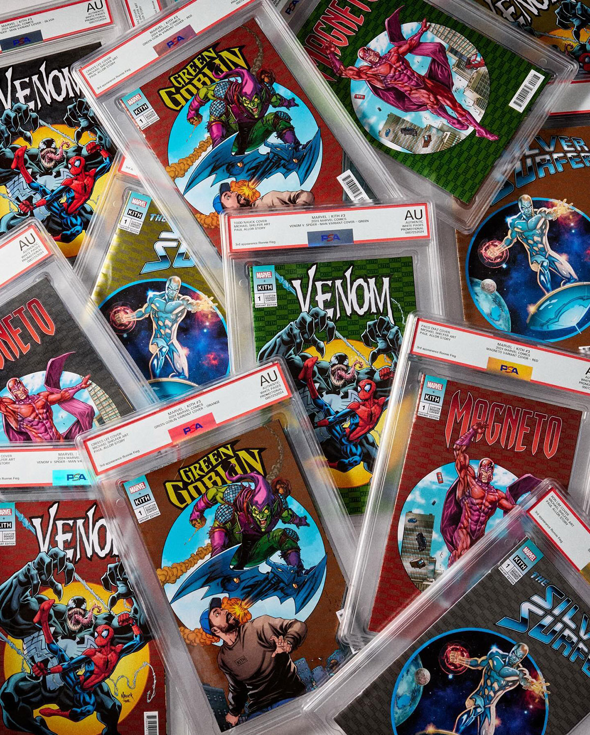 The ASICS GT-2160 and GEL-Kayano 14 are the two models on display here, although its possible more could be included. Special pairs for Magneto, Venom, and The Green Goblin among other fan favorites appear alongside co-branded Marvel x KITH comics, with the implication being that each shoe is accompanied by an exclusive edition. Diverging slightly from the overarching cast of characters, it also looks like Spider-Man stakes claim to a fitting red, white, and blue GT-2160.