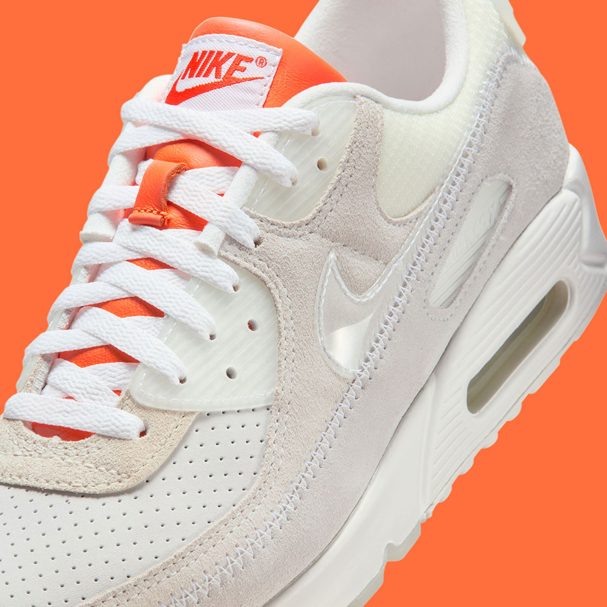 Perforated white leather makes up the toe box, while tactile mesh forms the collar. The eyestays and heel badge are made from semi-translucent TPU material, allowing Size?’s question mark logo to peek through on the heel. The mudguard alternates between two different shades of grey on the lateral and medial sides. The lateral side features exposed stitching and a clear TPU Swoosh, while the medial stands out with a lunar quarter reminiscent of the iconic Air Max Lunar90 SP from 2014. The tongue breaks from the greyscale palette in bright orange leather, while two sets of laces — one white and one orange with white stitching — are included.