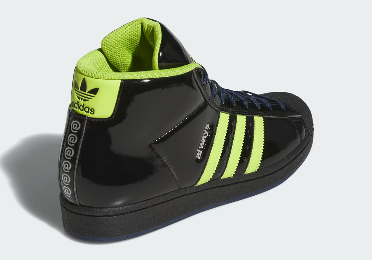 The sneaker in question; an adidas Pro Model ADV featuring black patent leather and attention-grabbing “Semi Solar Slime” on the stripes/lining. The brand’s signature “@” logo plays a big role, presented on the tongue, spine, and insoles. Silver “always” text runs along the stripes, while “Collegiate Navy” lands on the laces and outsole.