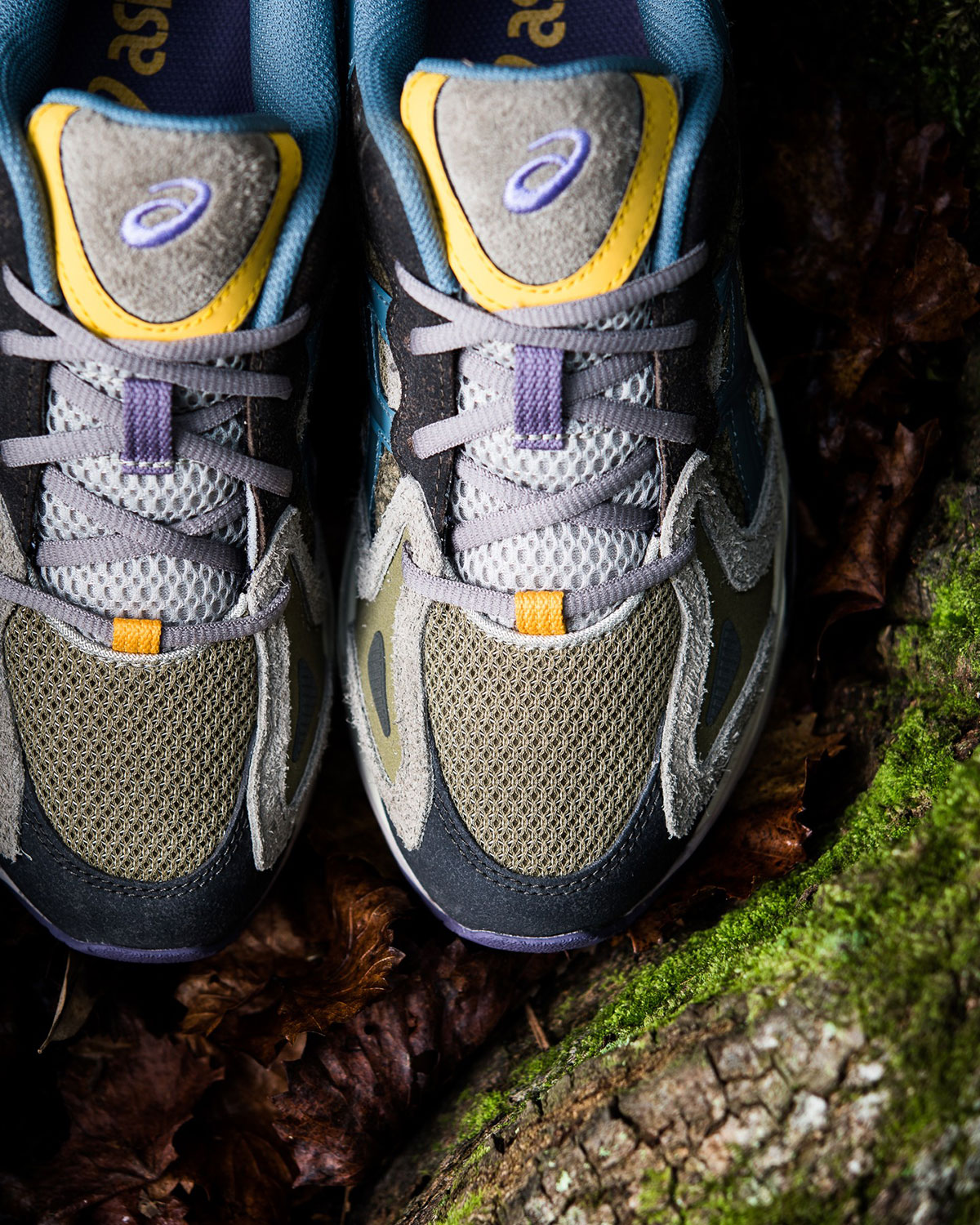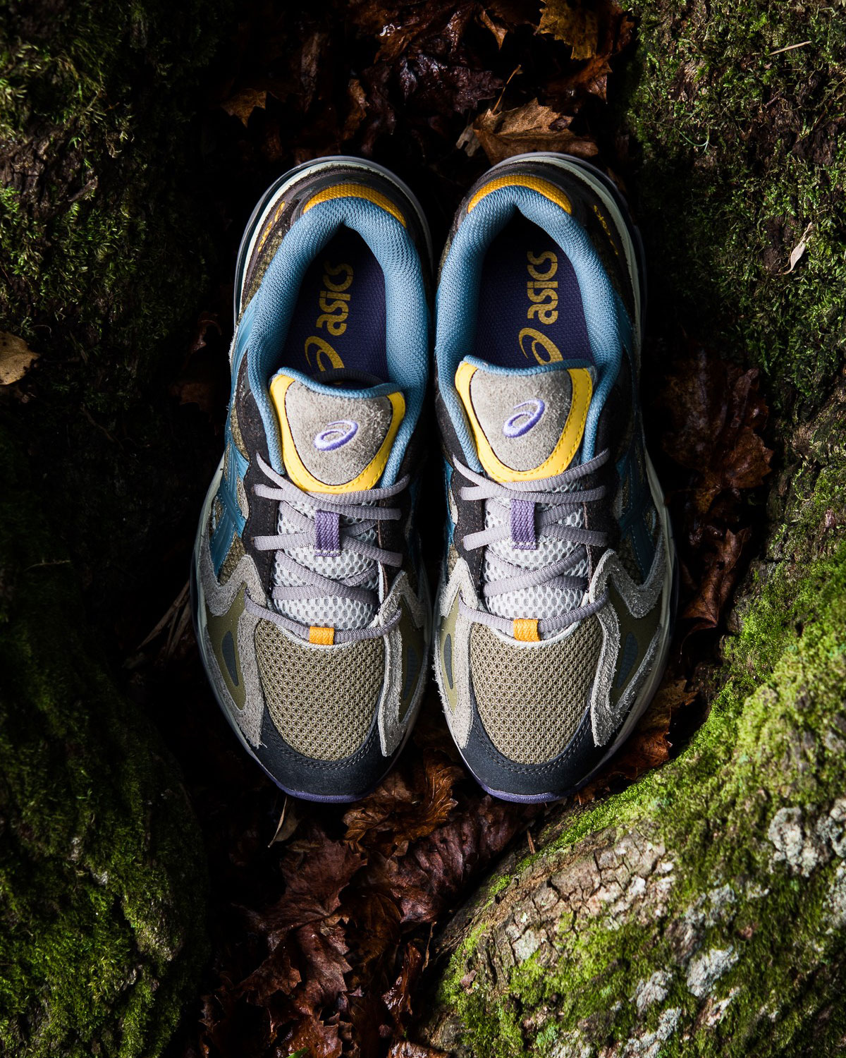 Multiple earthy shades span hairy suede and mesh, aptly matching the look of moss and bark. Blue synthetic overlays at the quarter add a slightly mystical touch, complemented by yellow hits on the tongue, heel, and ASICS logos.