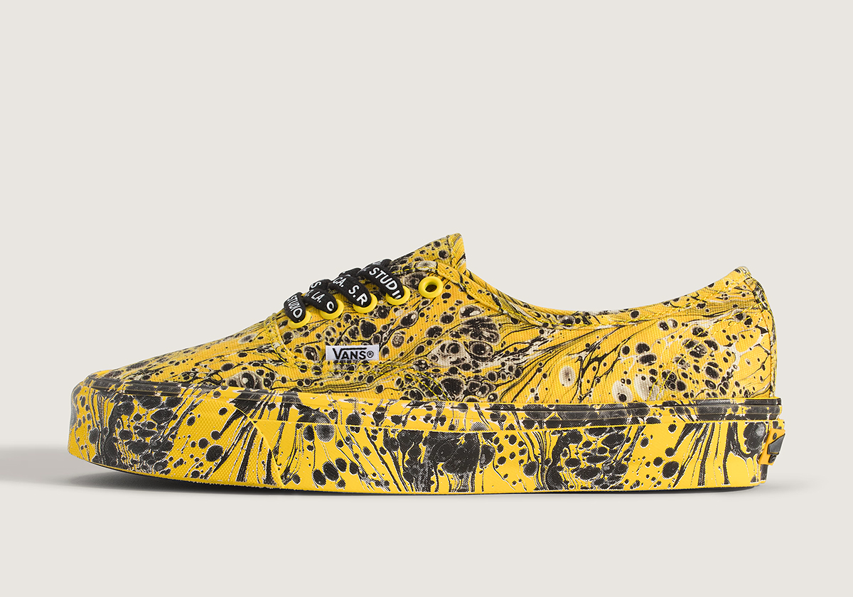 Now entering his third collection with the California company, Ruby and SR Studio are surprisingly paring back the scope of their output, scaling down from a four-headed collection towards the end of 2024 for a leaner two pair capsule teeing off for Fall ’25. Atop the Vans Authentic 44 and Old Skool 36, unmodified from their core construction aside from the use of Vibram soles, the label utilizes trademark hi-vis tonality with eye-catching yellow and black palettes. Of course, it’s the patterning over top that really sells either shoe, a collision of tar-like blotches that seep from the heel to toe with spindly connections in between. To close both designs and break up the otherwise cohesive layouts, white-on-black laces stamp the S.R Studio LA CA name, a hallmark of all of their work with Vans so far.