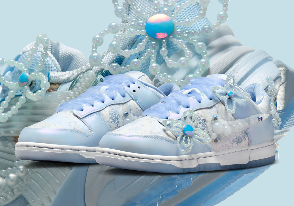Two sneakers make up the inaugural Susan Fang x Nike drop; the quintessential Dunk Low and uptrending Nike V2K Run. Both models come with a slew of chic embellishments, including Swoosh logos crafted from pearls, ribbon laces, and floral accents attached by buttons. Fang applies a soft baby blue colorway to each sneaker, with the V2K Run featuring mesh and Dunk featuring a patterned silk base layer.
