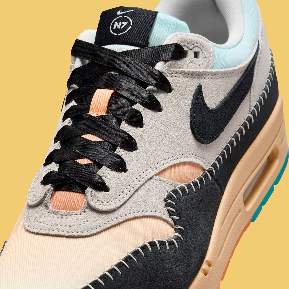At the forefront of Nike Sportwear’s archival hits, the Air Max 1 appears in a breathtaking color palette of light orange and blue shades against a black suede mudguard and a sesame-colored midsole. Thick ribbon laces and exposed stitchwork add to the traditional appearance of the shoe, although the spirit remains true to the 1987 running shoe classic. N7 logos appear just on the tongue and insole, with a special barb of Swoosh logos sitting as the foundation of the emblem.