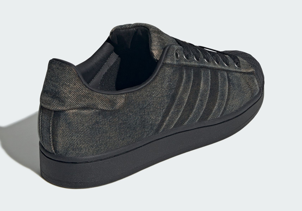 Two contrasting applications are on task, beginning with a grungy all-black. Built atop the Superstar 82 composition, aimed at recreating the original Made in France layout, washed patterns overcome the hardned fabric, bringing it closer to a dark grey in select splotches through the profile. At the quarter, you’ll find the biggest structural shift outside of the titular fabric, as the Three Stripes poke from underneath for an embossed flair rather than the usual stitched, tangible presentation. The partnering pair largely keeps the same script intac but opts for a different color-up, wearing more traditional blue hues on its exteriror while opting for white counterplay within the liner, laces, shell toe, and sole.