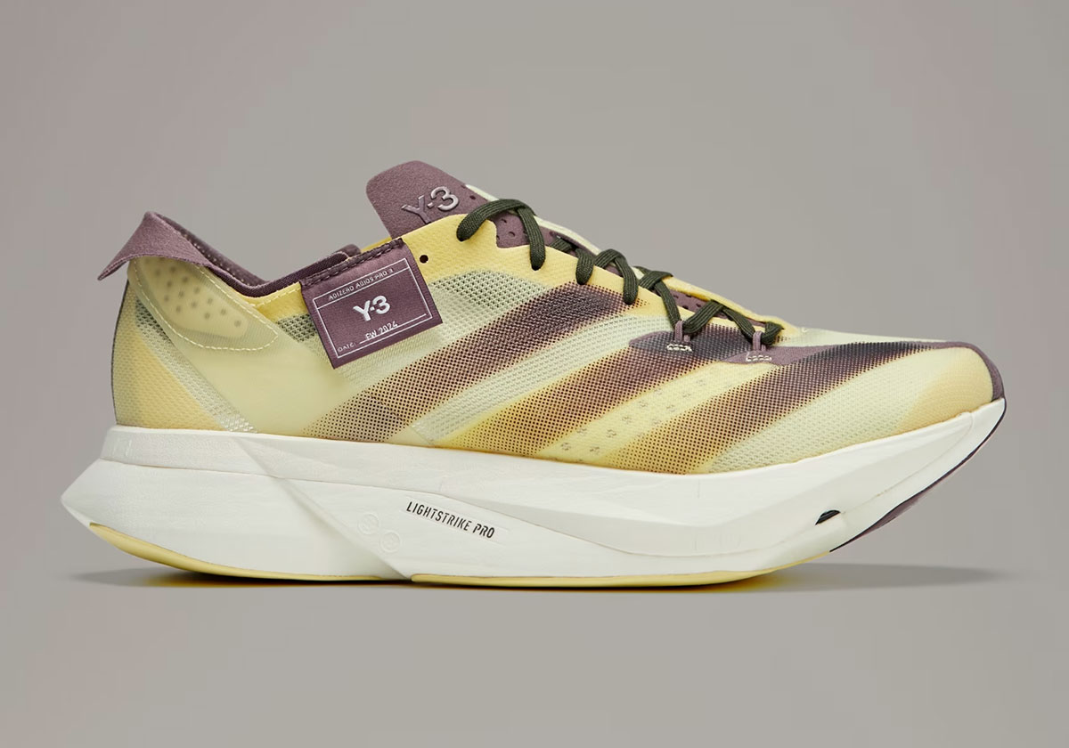 To the uninformed, Y-3 is a sub-brand helmed by Japanese designer Yohji Yamamoto often called upon to bring a fashion-forward touch to adidas performance product. Y-3 versions of the Adios Pro 3.0 feature the exact same performance specs of the standard model, differing purely from an aesthetic standpoint. This latest pair glistens up with an “Almost Yellow” base and outsole, complete with faded “Shadow Fig” stripes to match the tongue and lining. From a performance standpoint, key features include a Lightstrike Pro midsole and carbon-infused ENERGYRODS meant to minimize energy loss.