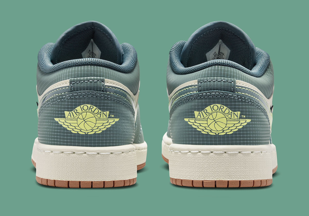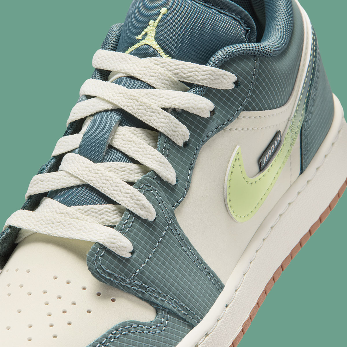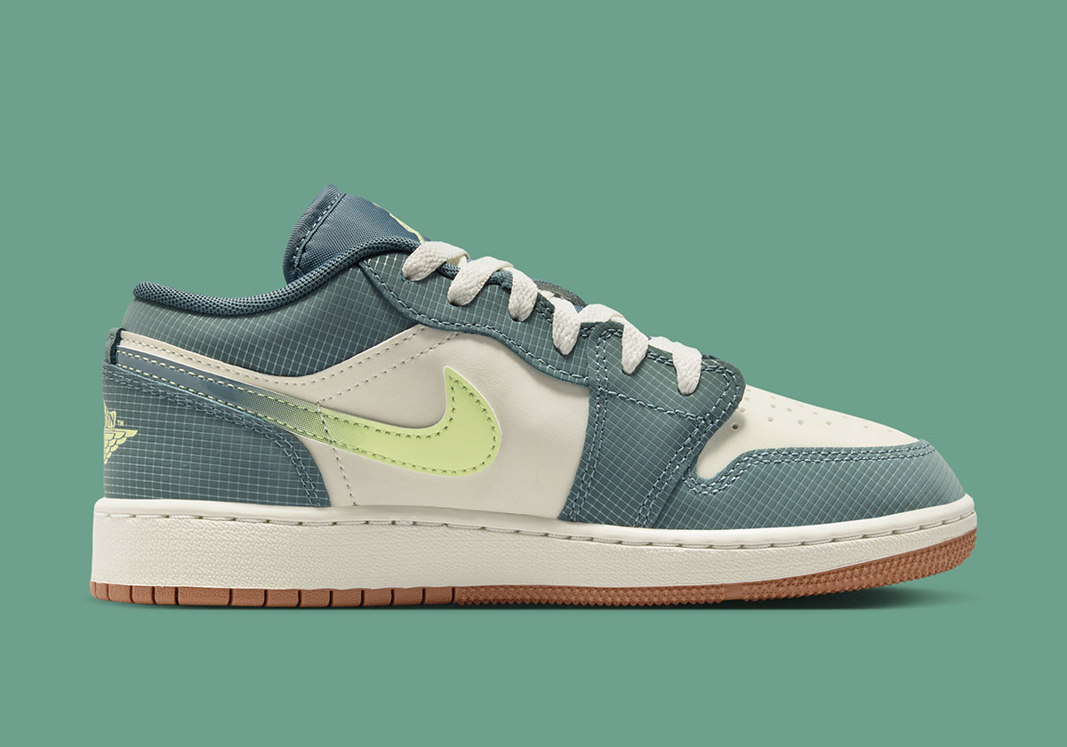 Two differing executions, built on the Air Jordan 1 Mid and the Air Jordan 1 Low, arrive in grade school sizing, either one echoing much of the colorway we first saw on the AJ3. On a hardware level, ripstop materials return to palpably speak to the title, but the ACG combination of vibrant tones and earthier counterplay stamps this as an outdoorsy Nike product from first glance. With a blend of teal, dark brown, and neon green, the Mid may achieve that more wholeheartedly, but the off-white anchoring of the Low counterpart still does an admirable job, particularly with its hi-vis gradient Swoosh. Jumpman carabiners and rocky insert paper close out this delivery as a whole.