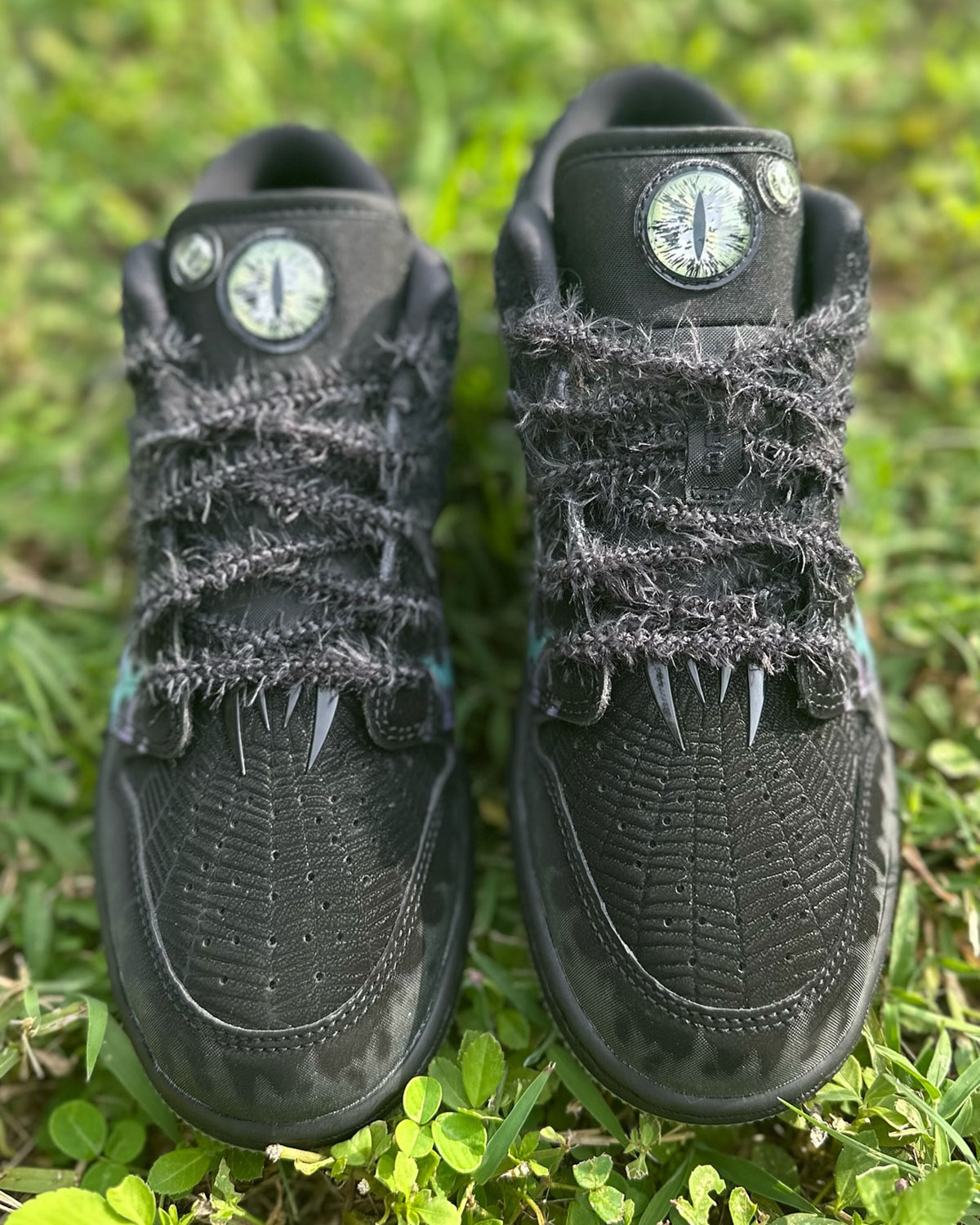 This latest set of images reveal the Black Cat Halloween Jordans in clearest view thus far, showing off the variety of details that match the eerie feline characteristics. Hairy shoe-laces, fuzzy suede, and ghoulish glow-in-the-dark graphics on the upper, and a matching outsole make these one of the most detailed Halloween sneakers since the “Mummy” SB Dunks from 2021. The big catch here is that the eyes on the tongue light up at the touch of a button; they were previously believed to be glow-in-the-dark.