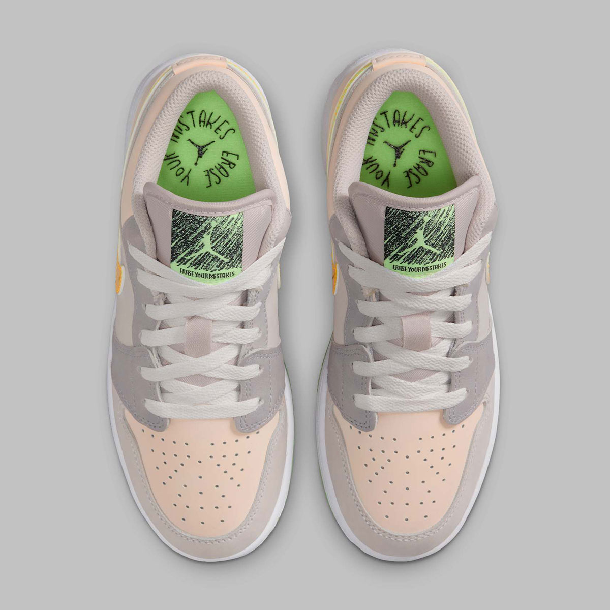 Up next in that group is the Air Jordan 1 Low “Erase Your Mistakes,” a continuation of kids footwear where Michael Jordan’s “beat the odds” story serves as a foundation to give to the next generation. Recall the Jordan Spizike Low “The Sky Is Not The Limit” for some precedent to this edition, here splitting the motto “Erase Your Mistakes, Write Your Greatness” across alternating tongue tags and outsoles.
