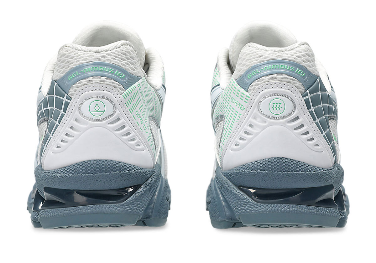 Most GORE-TEX sneakers that cross our desk feature flush, tight-knit exteriors designed to repel moisture. Not this GEL-Nimbus 10.1. Instead, it appears the model incorporates GORE-TEX underlays to preserve its signature airy mesh aesthetic. GORE-TEX branding appears in minty green in two locations: first on the heel of the lateral side and again in repeating fashion on the medial underlay. The rest of the design takes a fittingly icy approach, complete with a white leather toe, white mesh, and a hazy “Fjord Grey” shade across the sidewalls and Kayano 14 sole unit.