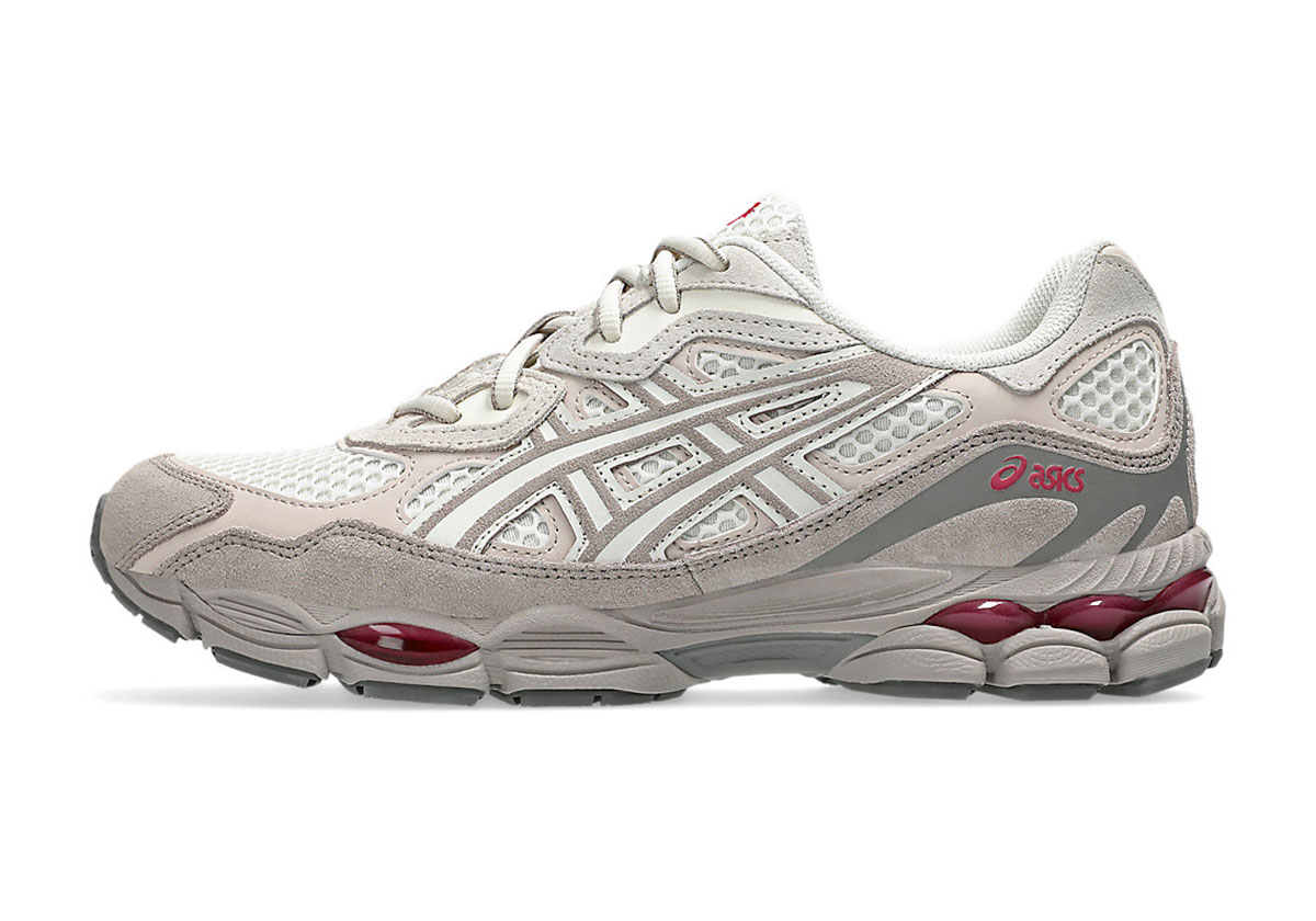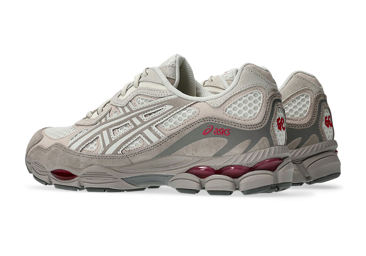 The look in question sticks around in the neutral home base that we’ve spotted on the model throughout its lifespan, utilizing a range of “Cream” shades on its upper half before dimming its profile with heavy doses of “Moonrock” underfoot. What really gives this shoe its character are the flares of red in the exposed GEL units and on the embroidered GEL tag on the heel.