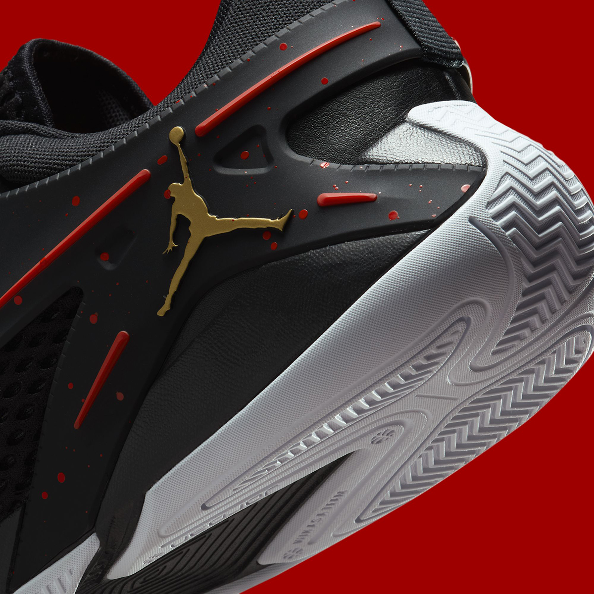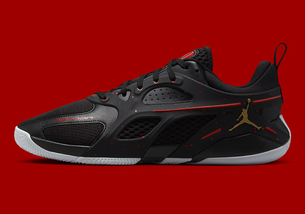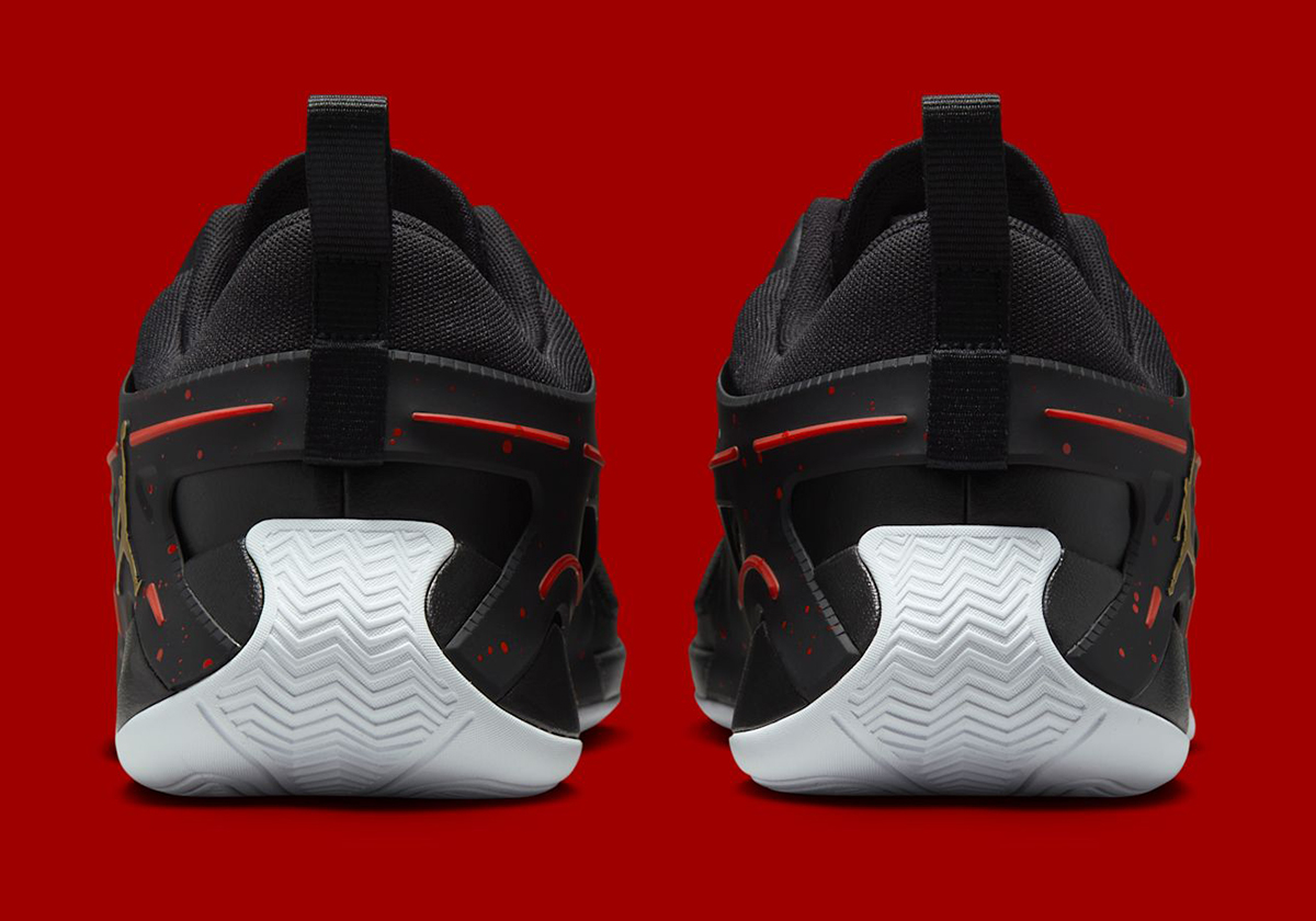 Though indeed not carrying that same historical context and legacy, the Jordan Heir has followed in the wake of its namesake to date. It has its own colorful array at its disposal, but “Bred” aesthetics have been its home base, explored very early on into its run and later with a “Bloodline” variation. In the darkest attempt yet, the pair at hand dedicates most of its real estate to jet black, but alludes to that sanguine concept with red speckling on the TPU side cage. A white outsole brings some brightened contrast, as does a gilded Jumpman at the rear. Of course, the performance notes that the Heir has championed throughout its lifespan remain: multi-zone herringbone traction, a drop-in midsole, and an all-around cage for stability.