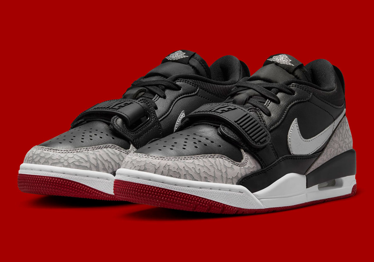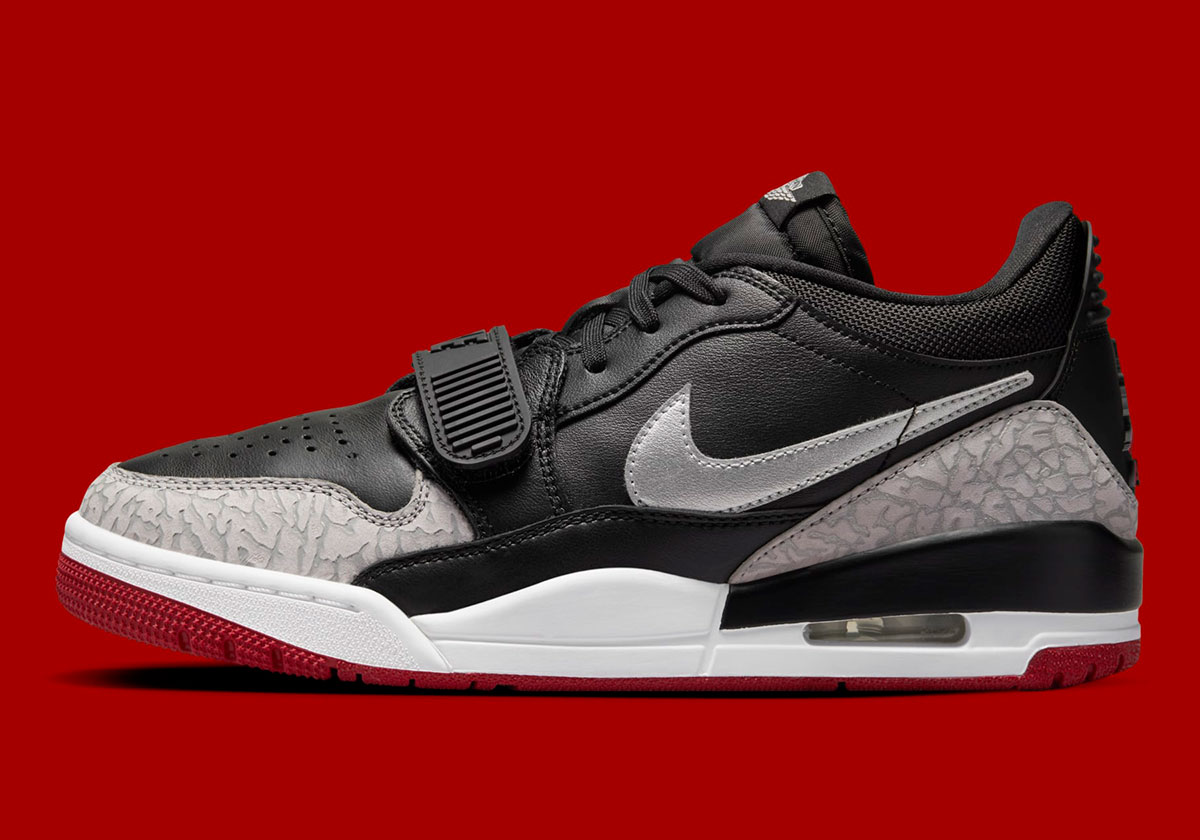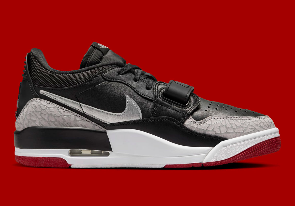 Although this is hardly an accurate attempt at the classic colorway, the Legacy 312 Low still impresses with the near-identical and all-too-familiar color palette of Black, Gym Red, and Cement Grey. Where this hybrid pair distinguishes itself is the metallic silver application on the Swoosh logo, and the modified colors on the elephant print seen on the toe-guard and heel (the veins are a much lighter shade of grey than what’s seen on the Air Jordan 3).