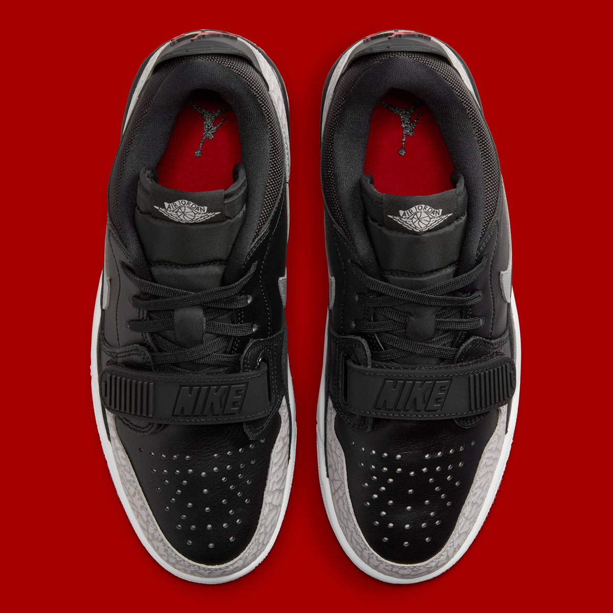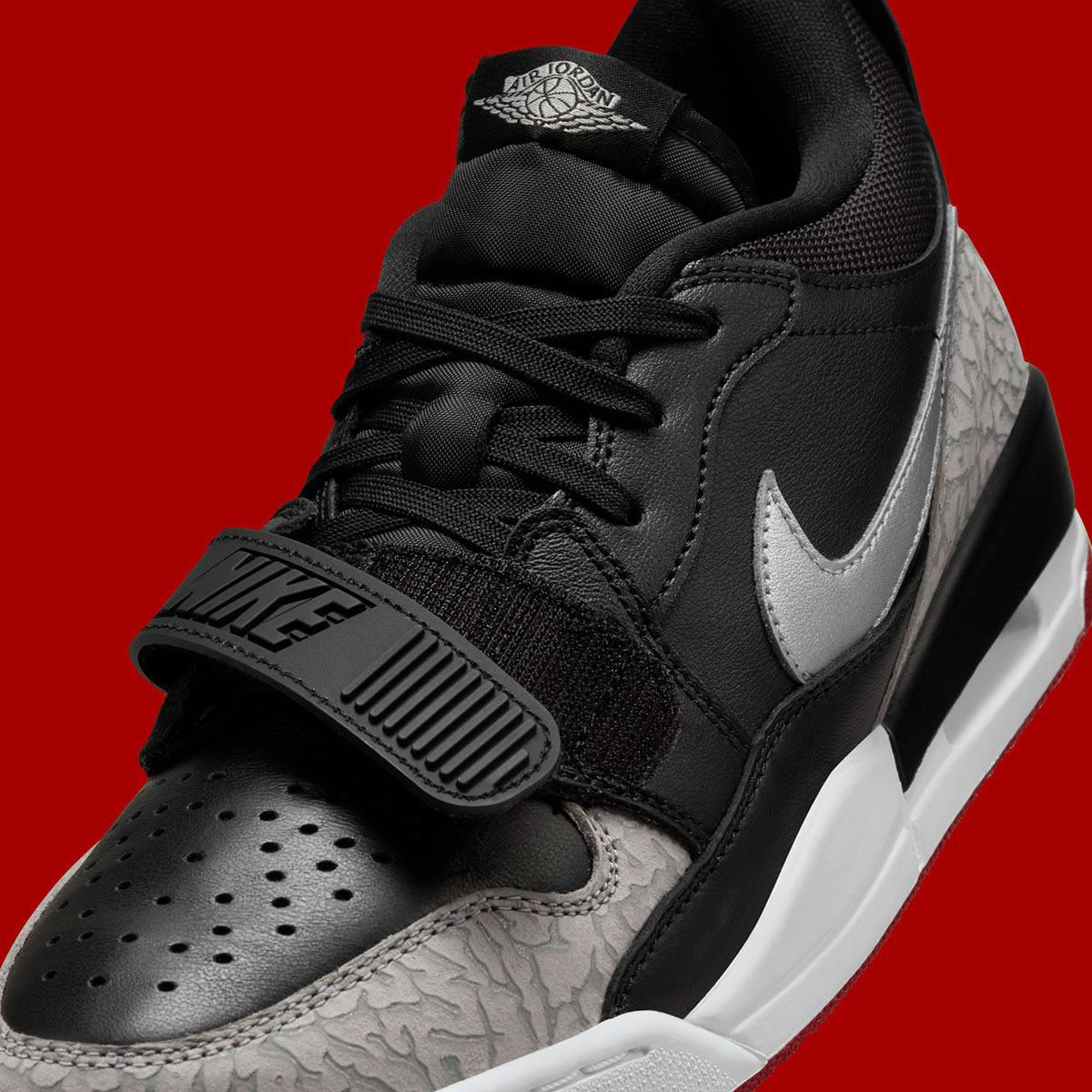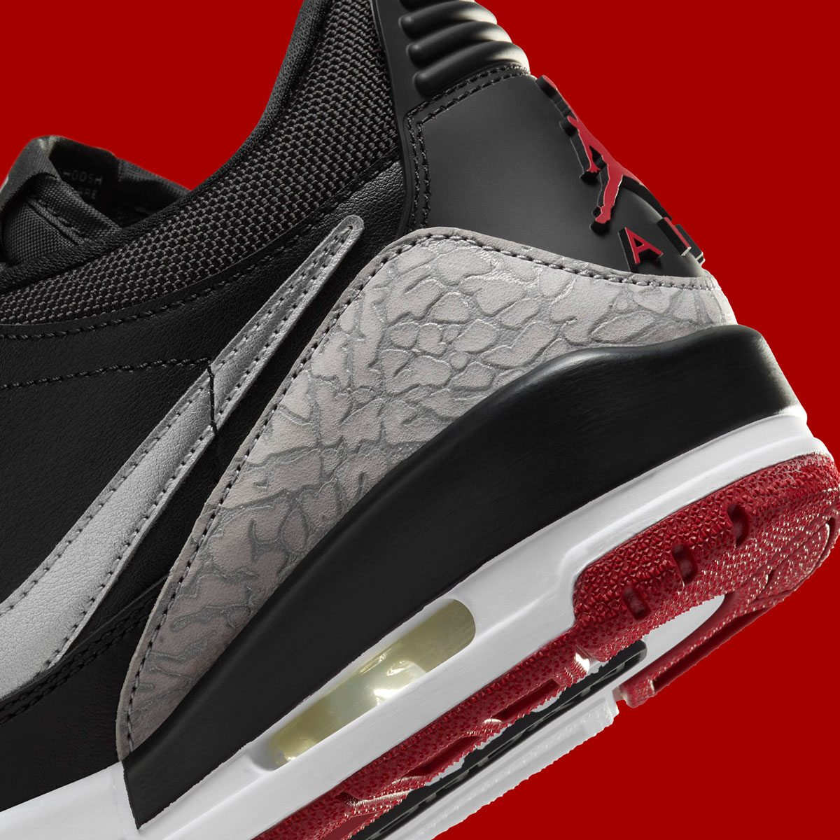 Although this is hardly an accurate attempt at the classic colorway, the Legacy 312 Low still impresses with the near-identical and all-too-familiar color palette of Black, Gym Red, and Cement Grey. Where this hybrid pair distinguishes itself is the metallic silver application on the Swoosh logo, and the modified colors on the elephant print seen on the toe-guard and heel (the veins are a much lighter shade of grey than what’s seen on the Air Jordan 3).