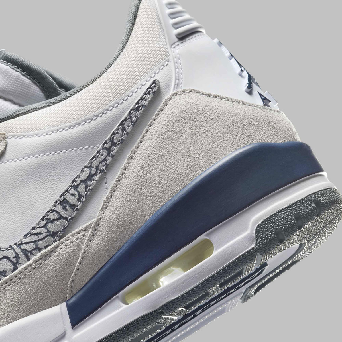 As one of the compositional touchstones for the Legacy 312 already, the AJ3 has loomed over every look the silhouette has issued. Yet with the elephant print Swoosh seen here, its influence is absolutely undeniable. WIth the tones of “Cool Grey” and “Midnight Navy” plastered throughout that pattern and in further pops on the upper, the AJ3’s look of the same name is a comparison, as is the “Georgetown” look utilized heavily in the Retro slate and on the Air Jordan 1.