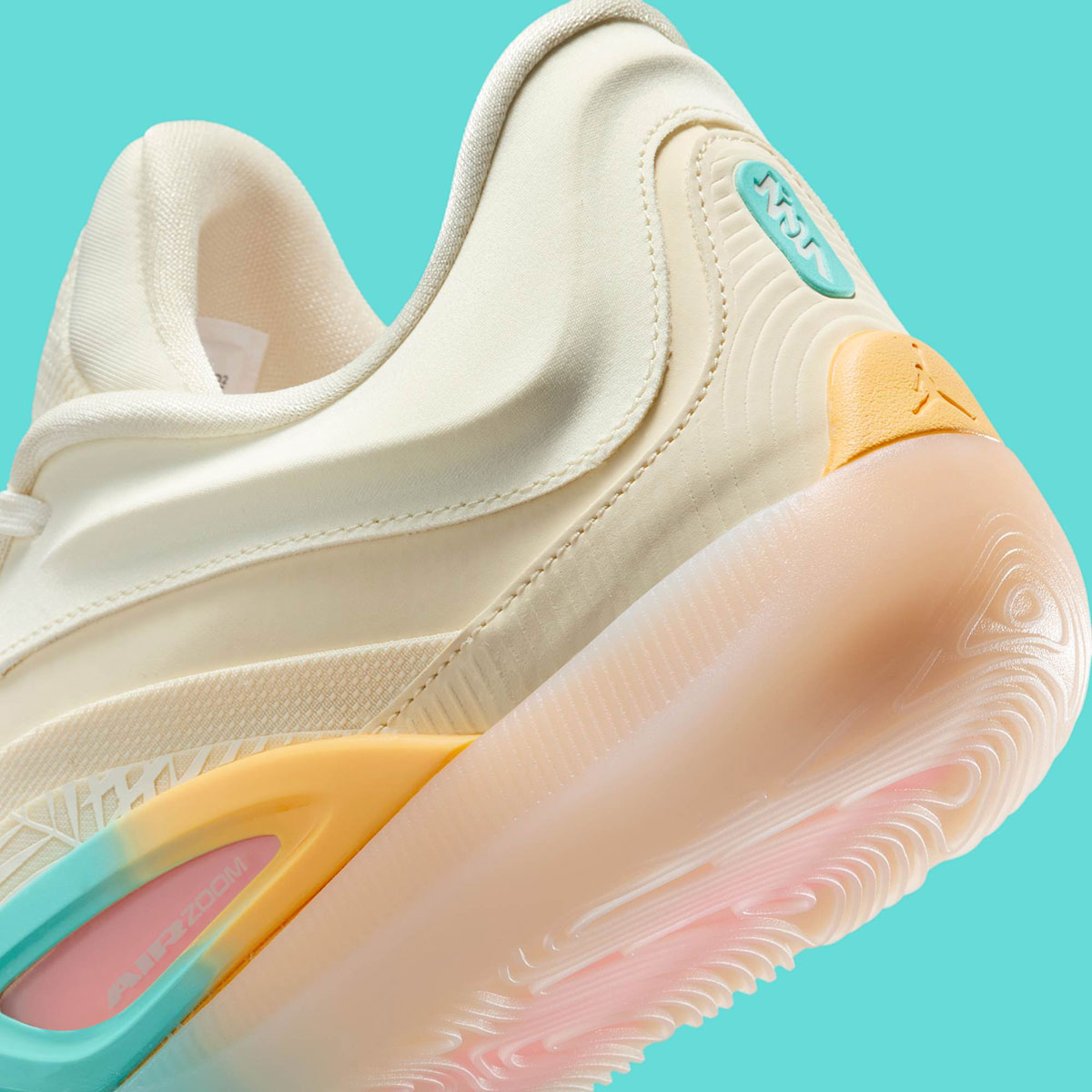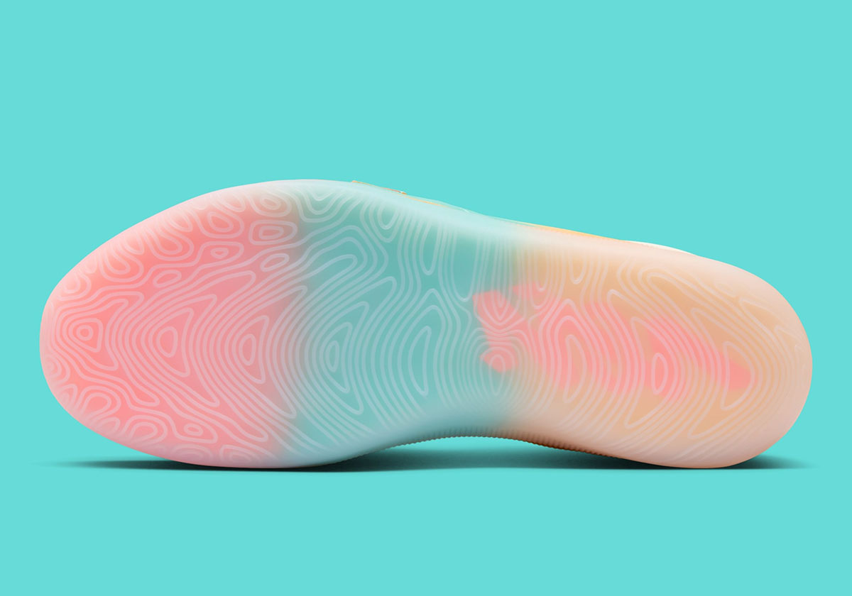 Though there’s a natural comparison to the “Forged In Fire” edition given its heavy use of warmer colors, this pair sets apart beginning with its upper, wrapped in sandy shades throughout. From there, sunset orange and yellow flank teal on either side, creating a gradient utilized on the TPU anchoring at the midfoot and the outsole underfoot. Etched grooves on panels at the quarter and heel further drive home the picturesque atmosphere by alluding to dunes and palm fronds, the final touch on this breezy variation of the Zion 4.