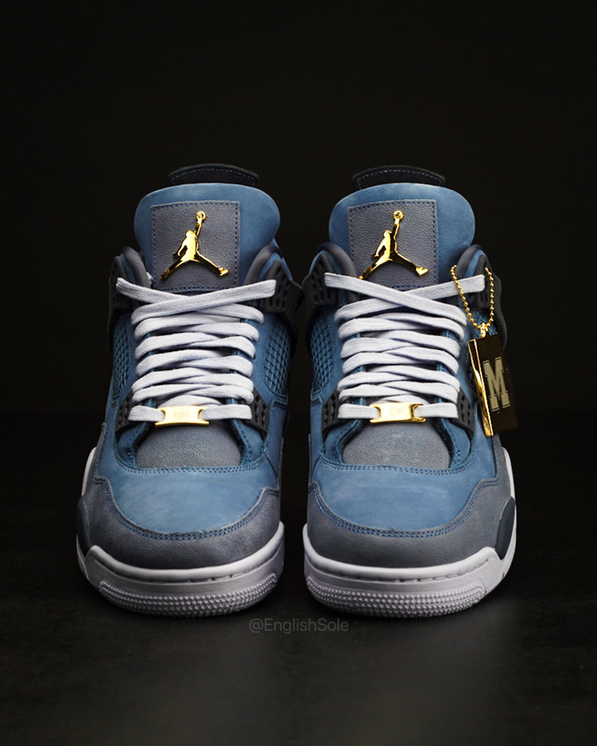 The first impression of this AJ4 is how it breaks from the two-tone scheme that many of the previous “First Class” editions have capitalized on. Instead, the Wolverines opt for a tri-tone delivery, utilizing dusty dark blue on the mudguard and down the tongue, trademark cerulean on the shoe’s suede body, and some deep navy hits on the wings/eye-stays, heel tab and midsole. In the process, the textured ostrich leather that’s defined this crop of AJ4s continues to highlight this shoe’s premium construction. The “Michigan” Air Jordan 4 further keeps to the series’ script with extremely subtle branding. Outside of the gilded hangtag with the iconic M logo and a similarly branded lace dubrae, the school’s “Go Blue” motto on the inside tongue is the only distinguishing factor that marks this as a school-specific PE.