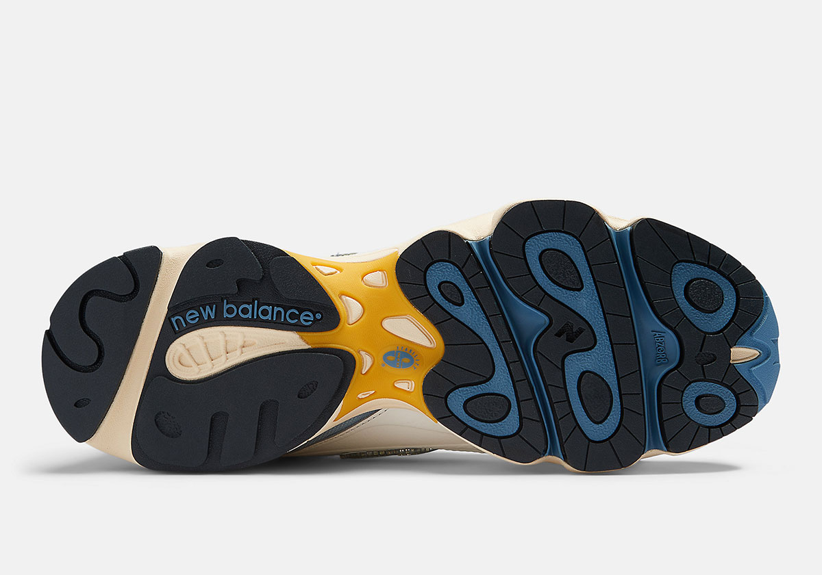 Close in essence to the “Angora” colorway that dropped in June, the shoe establishes a clear “dad shoe” vibe with a cream midsole and overlays, letting accent colors carry the look. A sky blue gradient peeks through on the base, contrasted by a glossy, yellow TPU New Balance logo on the lateral quarter. Both colors also touch up the eyelets, tongue branding, and outsole, while the yellow hue alone accounts for the stitched overlay accents and added heel padding.